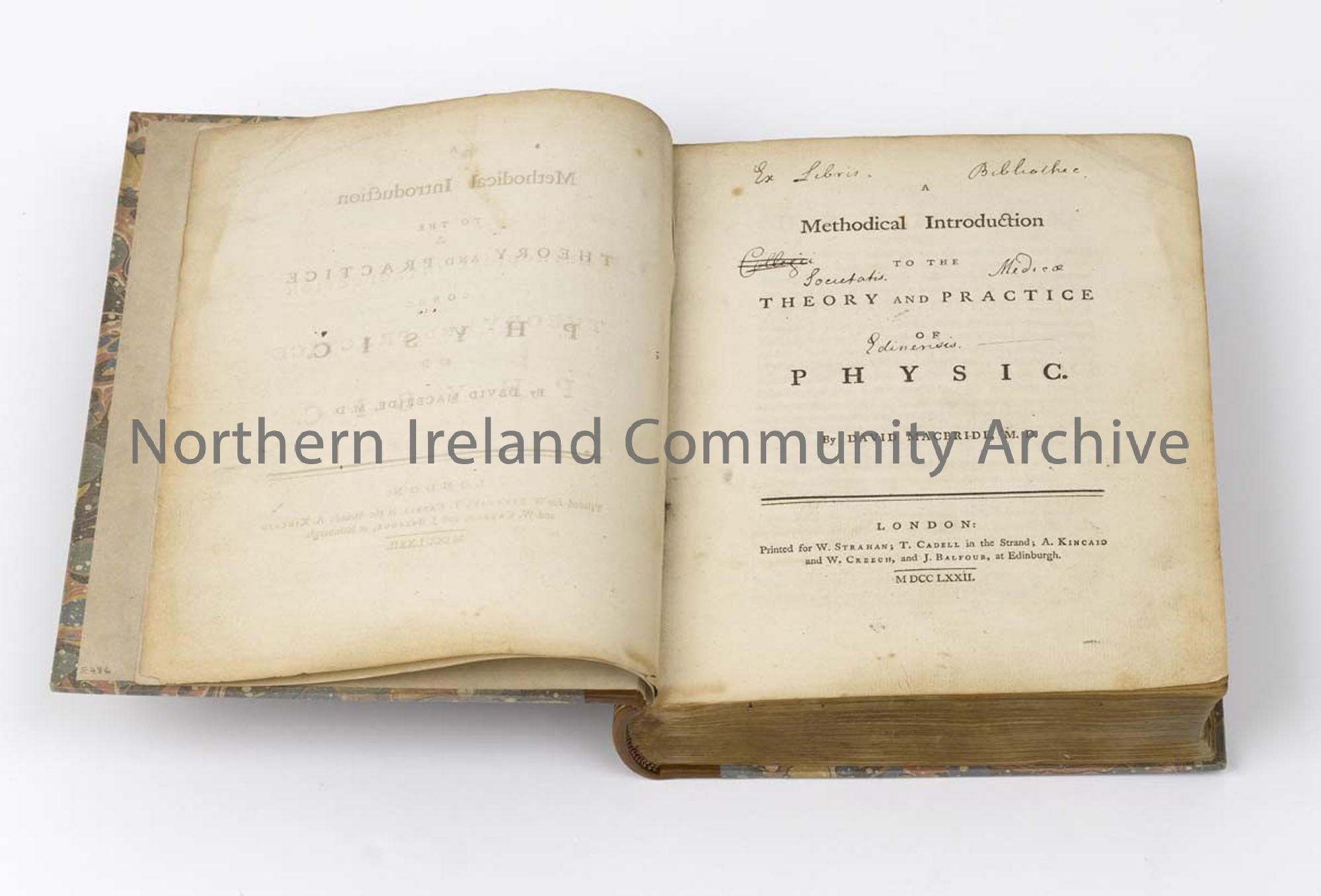 'A Methodical Introduction to the Theory and Practice of Physic' by David Macbride MD 1776. It is based on a series of medical lectures he gave in his home in the winter of 1766-7. The book was later translated into Latin, German, French and Dutch. MacBride also published a volume of his 'Experimental Essays' and these two books made him one of the most distinguished physicians of his day.
