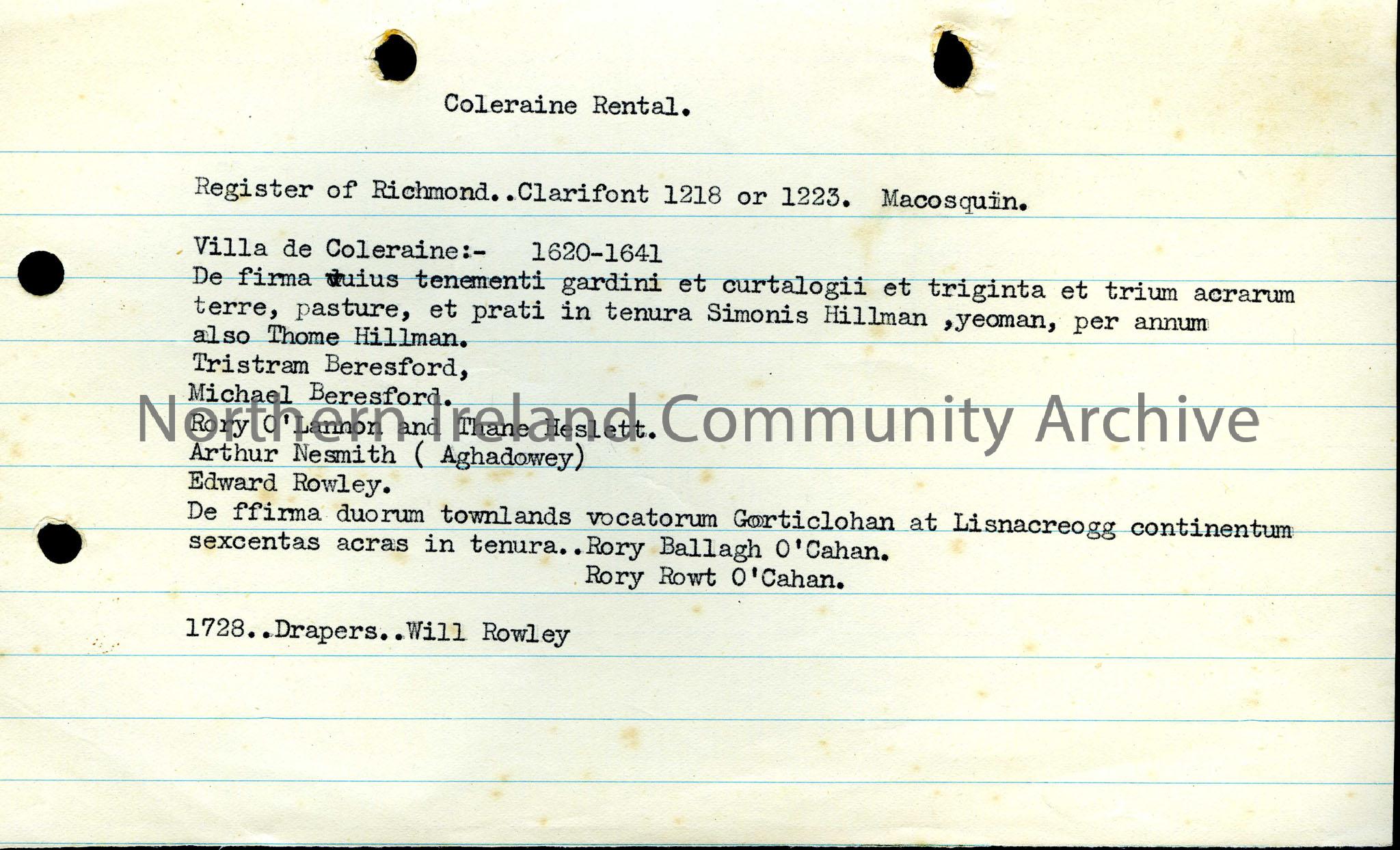 A note headed "Coleraine Rental". It starts with Register of Richmond...Clarifont 1218 or 1223. Macosquin. There follows a letting agreement in Latin for Coleraine 1620-1641 that mentions the following names: Hillman; l Beresford; O'Lannon,; Heslett; Nesmith, Rowley and O'Cahan.