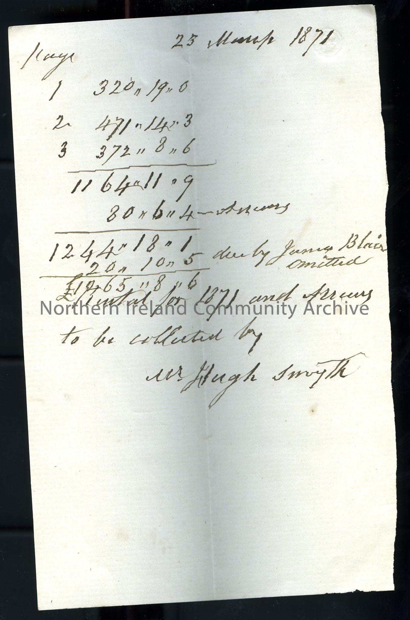 A note on a single sheet of paper. Handwritten records of accounts, ‘Rental for 1871′. Possibly notes rent due by tenants (eg.’due by James Blair…’)…