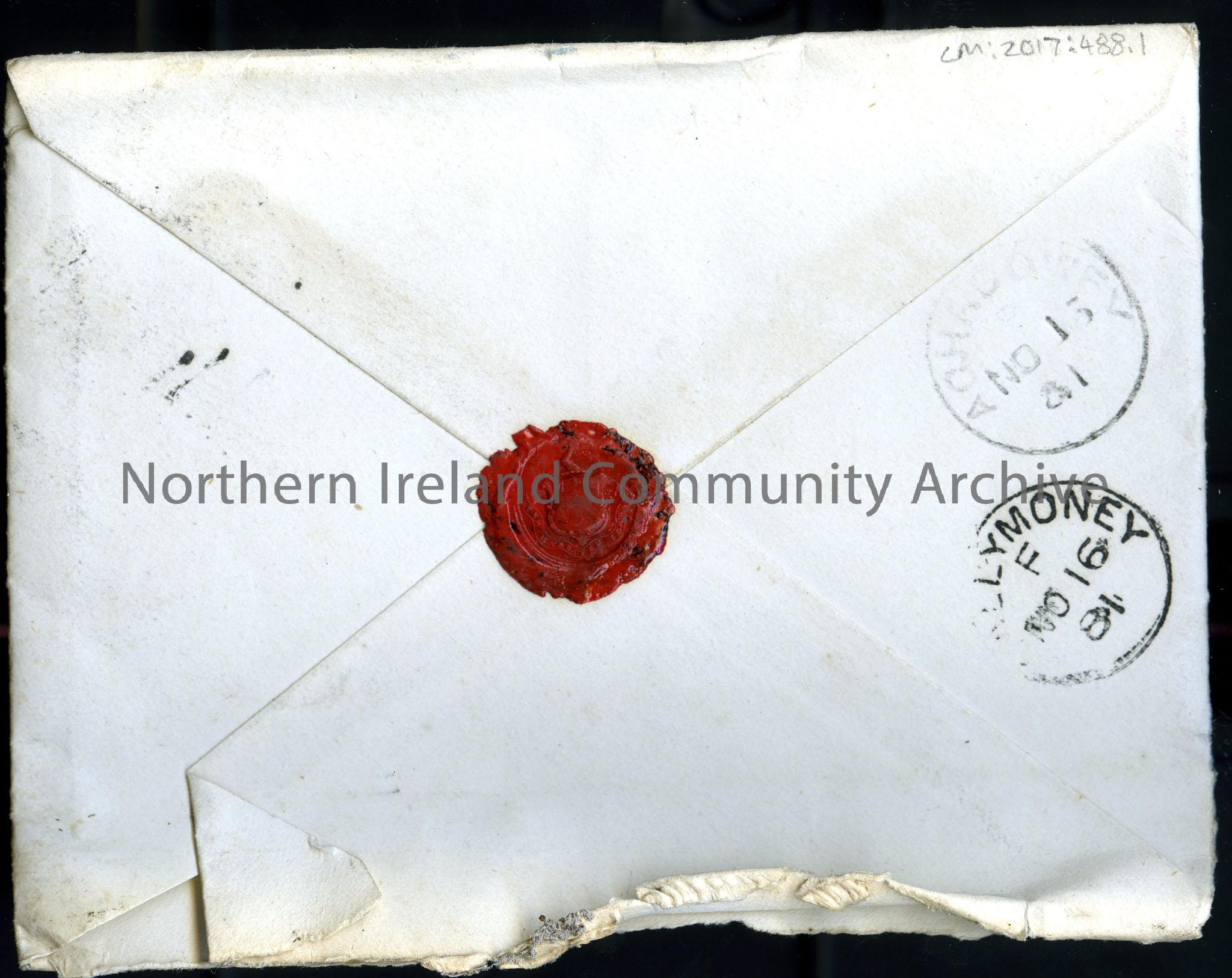 A paper envelope with a red wax seal on reverse. Envelope addressed to ‘John Hezlet Esq. Bovagh, Aghadowey, Co. Derry, Ireland’. Red wax seal is a cre… – scan480b