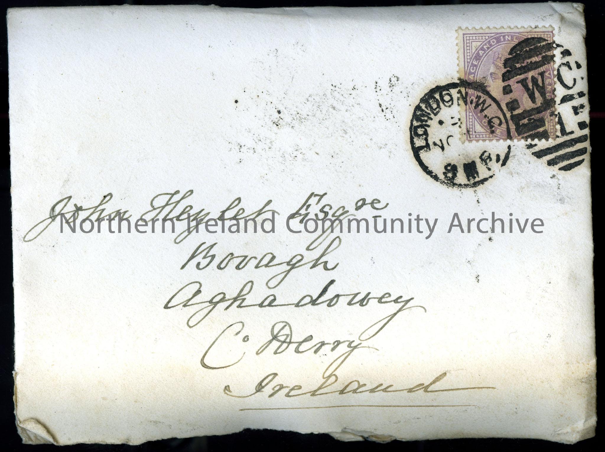 A paper envelope with a red wax seal on reverse. Envelope addressed to ‘John Hezlet Esq. Bovagh, Aghadowey, Co. Derry, Ireland’. Red wax seal is a cre…