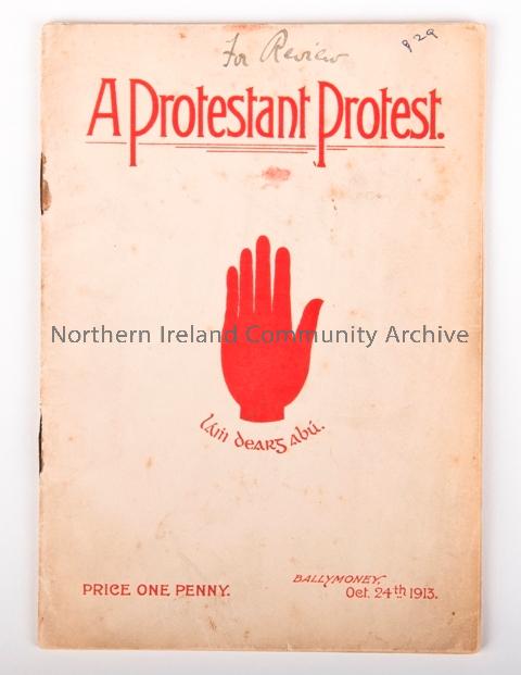 Political Pamphlet called "A Protestant Protest". Dated October 24 1913. This pamphlet highlights the opposition to Home Rule. Courtesy of Ballymoney Museum.