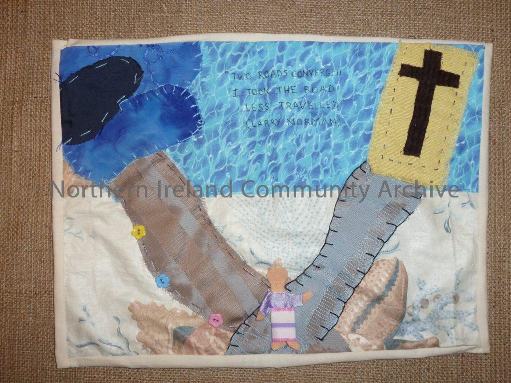 Arpillera produced by Anne Morrow as part of Stitching and Unstitching the Troubles for PEACEIII Cultural Fusions. FOr information on Conflict Textiles international collection of arpilleras and the exhibitions this arpillera has been featured in . please follow the link h