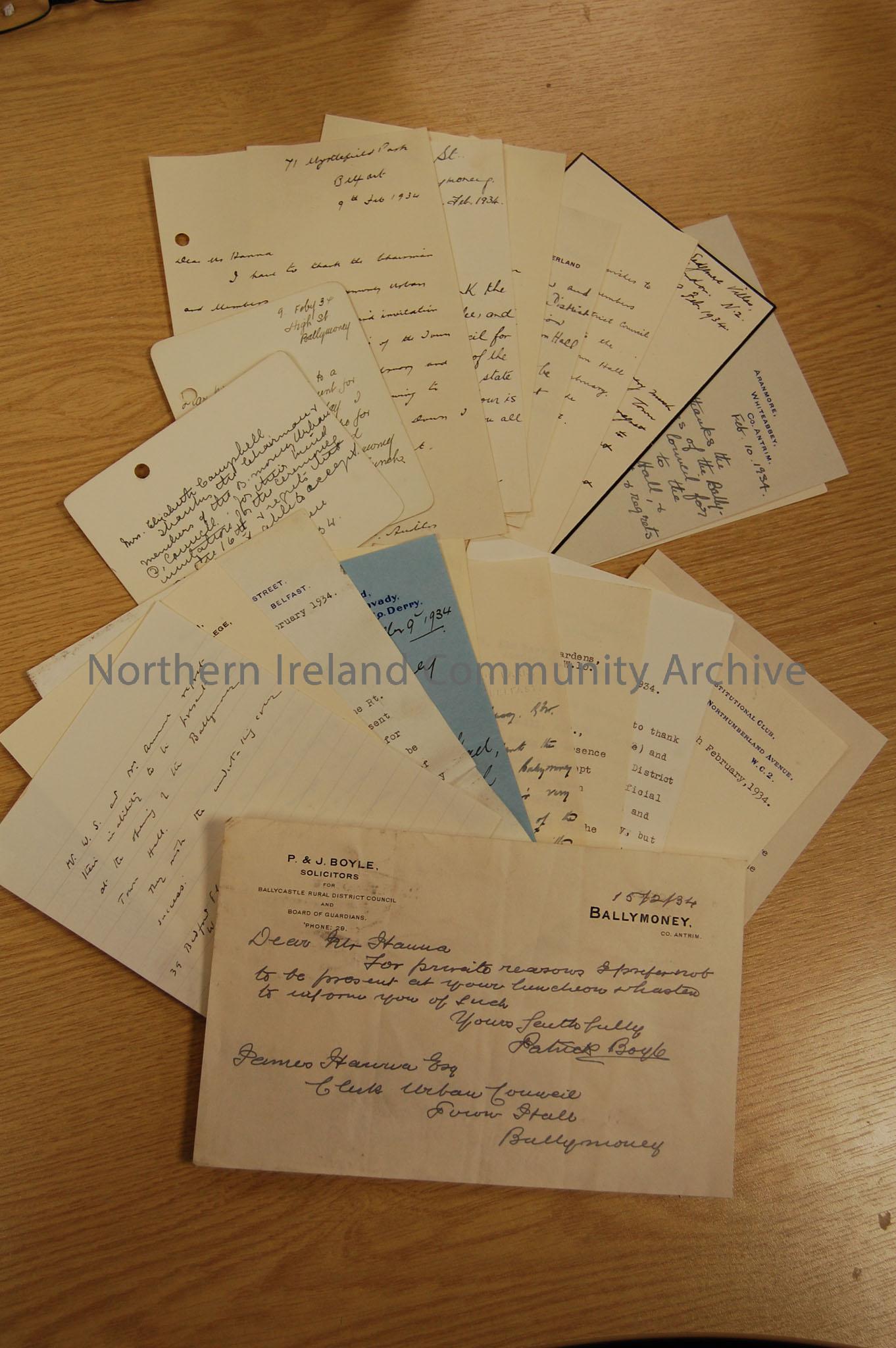 A variety of cards and letters declining the invitation to the re-opening of the Town Hall on Friday 16th February 1934