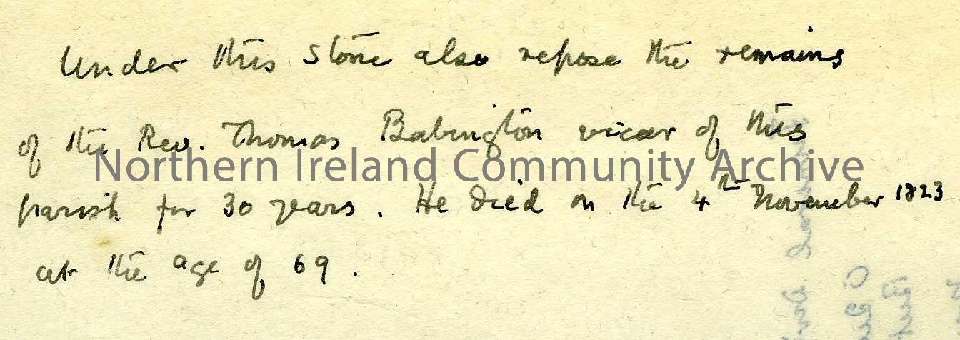 A verse, mixture of typed and handwritten, translated in Latin, Irish and English. Line in English refers to a funeral dirge for a Reverend Pastor Jer. O'Quinius. Small piece on reverse refers to burial site of a Rev Babington in 1823