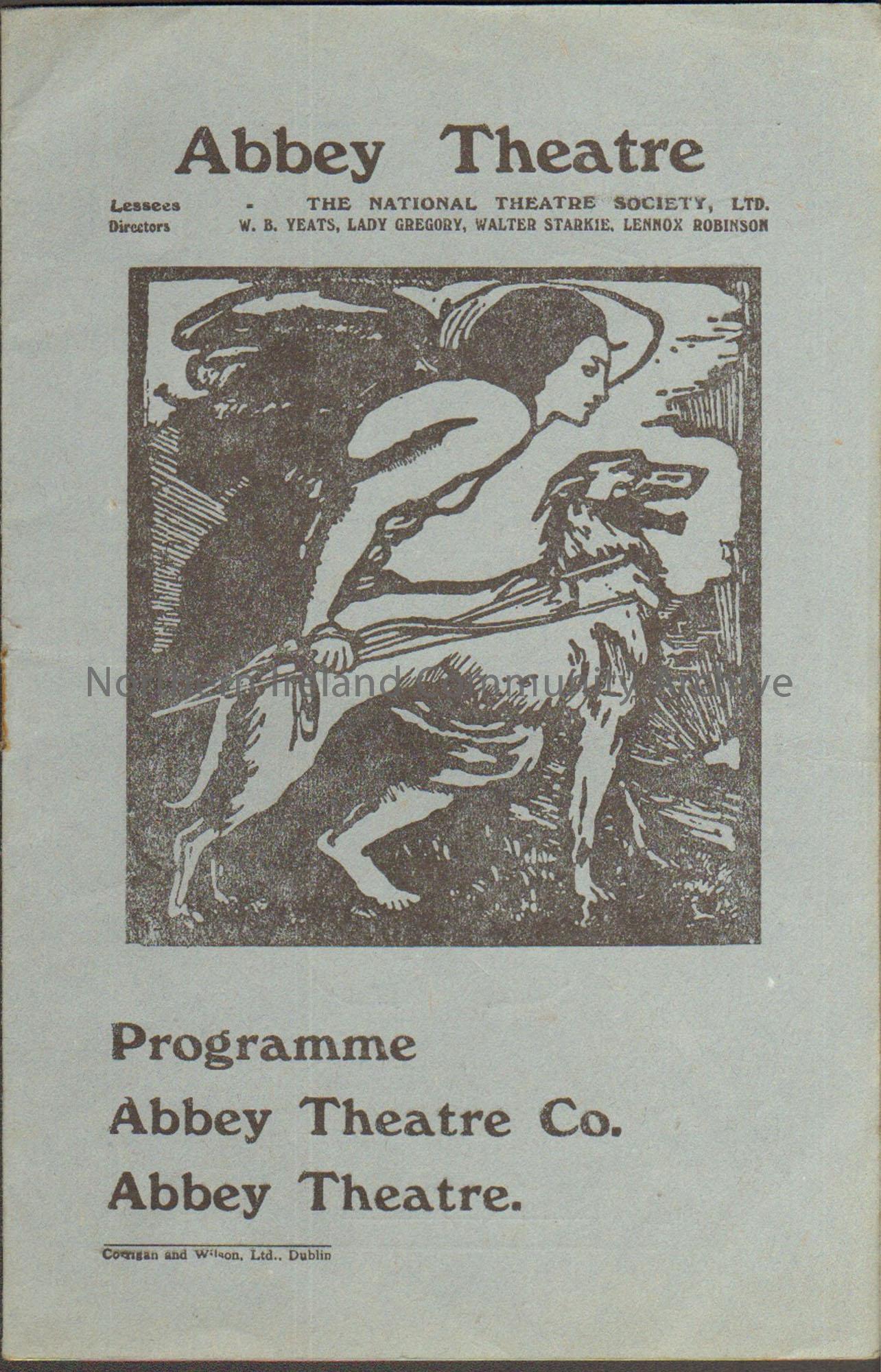 Abbey Theatre programme for a showing of Cartney and Kevney by George Shiels for the week beginning Monday 22nd April 1929.Grey cover with black drawing of a woman with a dog.