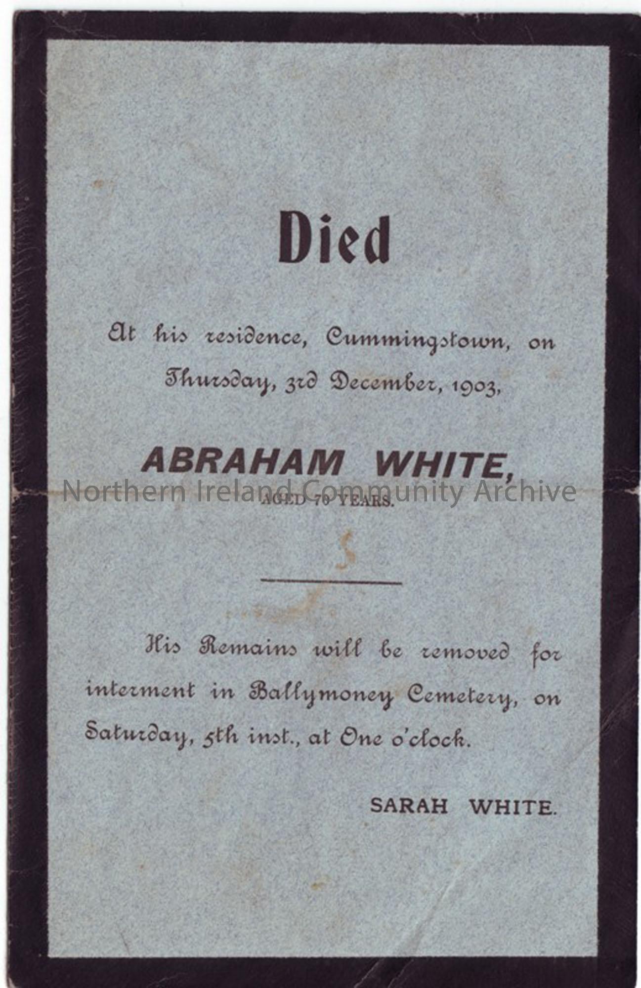Abraham White of Cummingstown, buried in Ballymoney Cemetery d. 3rd December 1903, aged 70 years