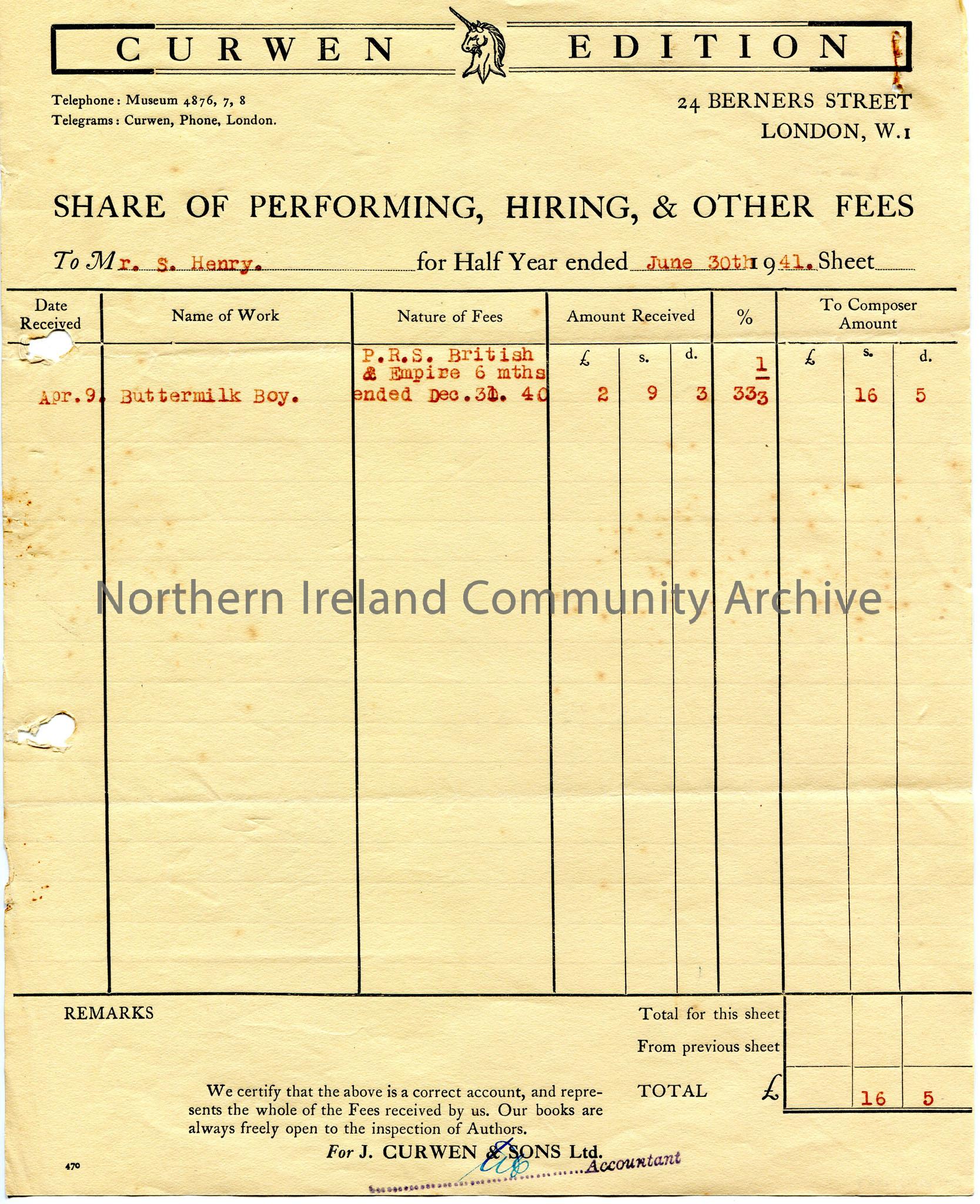 Account for Sam Henry for royalties received for use of ‘The Buttermilk Boy’ song for 6 months until 31st December, 1940. Total received £0 16 5.