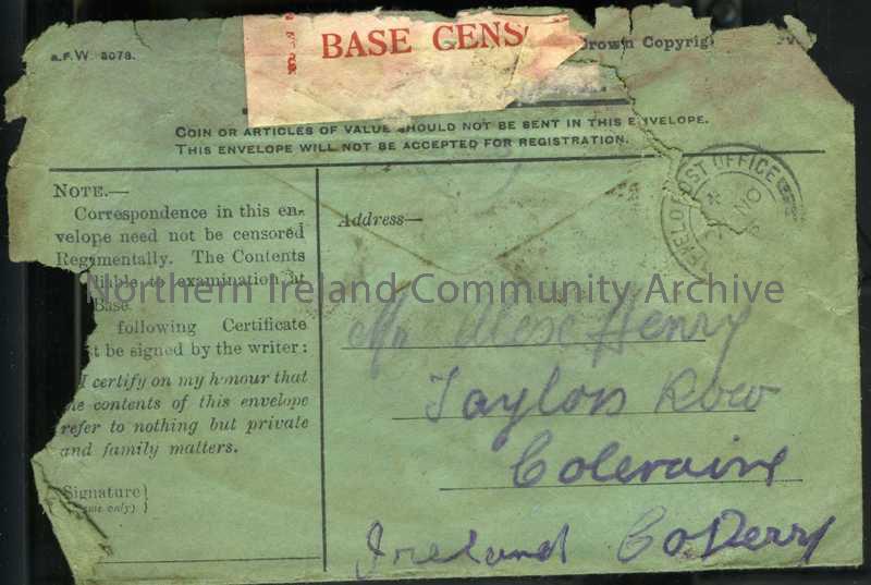 Addressed green standard 'On Active Service' envelope