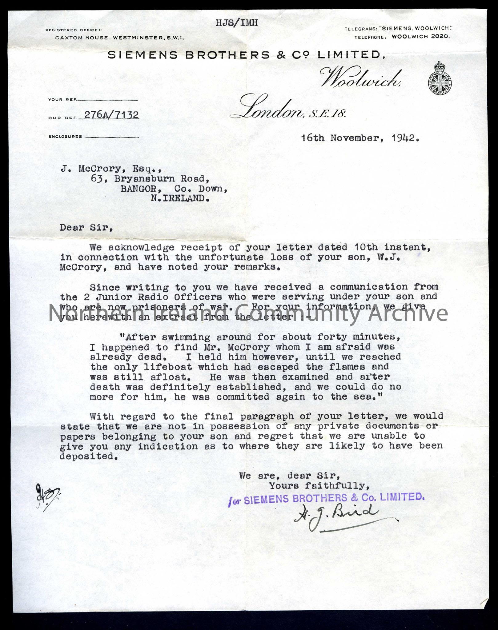 Addressed to J McCrory from H. G. Bird, Siemens Brothers & Co. Limited. Sent from Woolwich, London and dated 16.11.1942. Letter acknowledges receipt of letter from 10th instant. Gives extra information about Bill's death provided by 2 junior radio officers who are prisoners of war. It also mentions not being in possession of any private documents or papers of Bills.