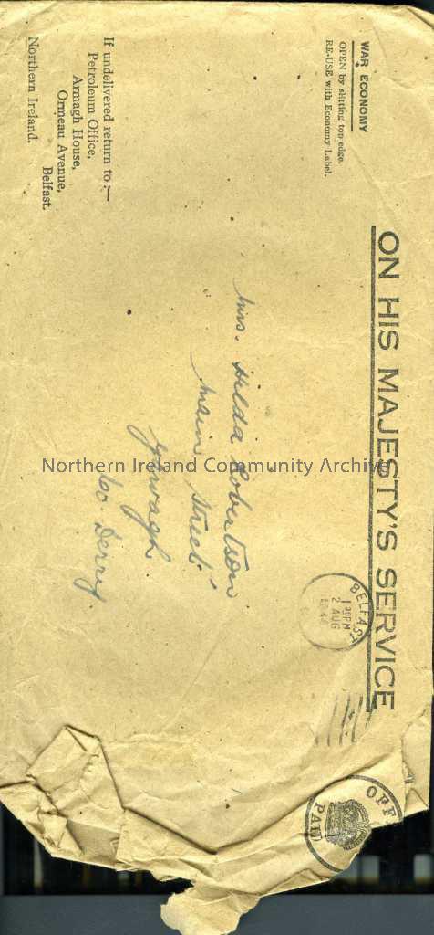 Addressed to Miss Hilda Robertson, Main Street, Garvagh. Postage stamp reads Belfast 2 Aug 1944. Sent from Petroleum Office, Armagh House, Ormeau Aven…