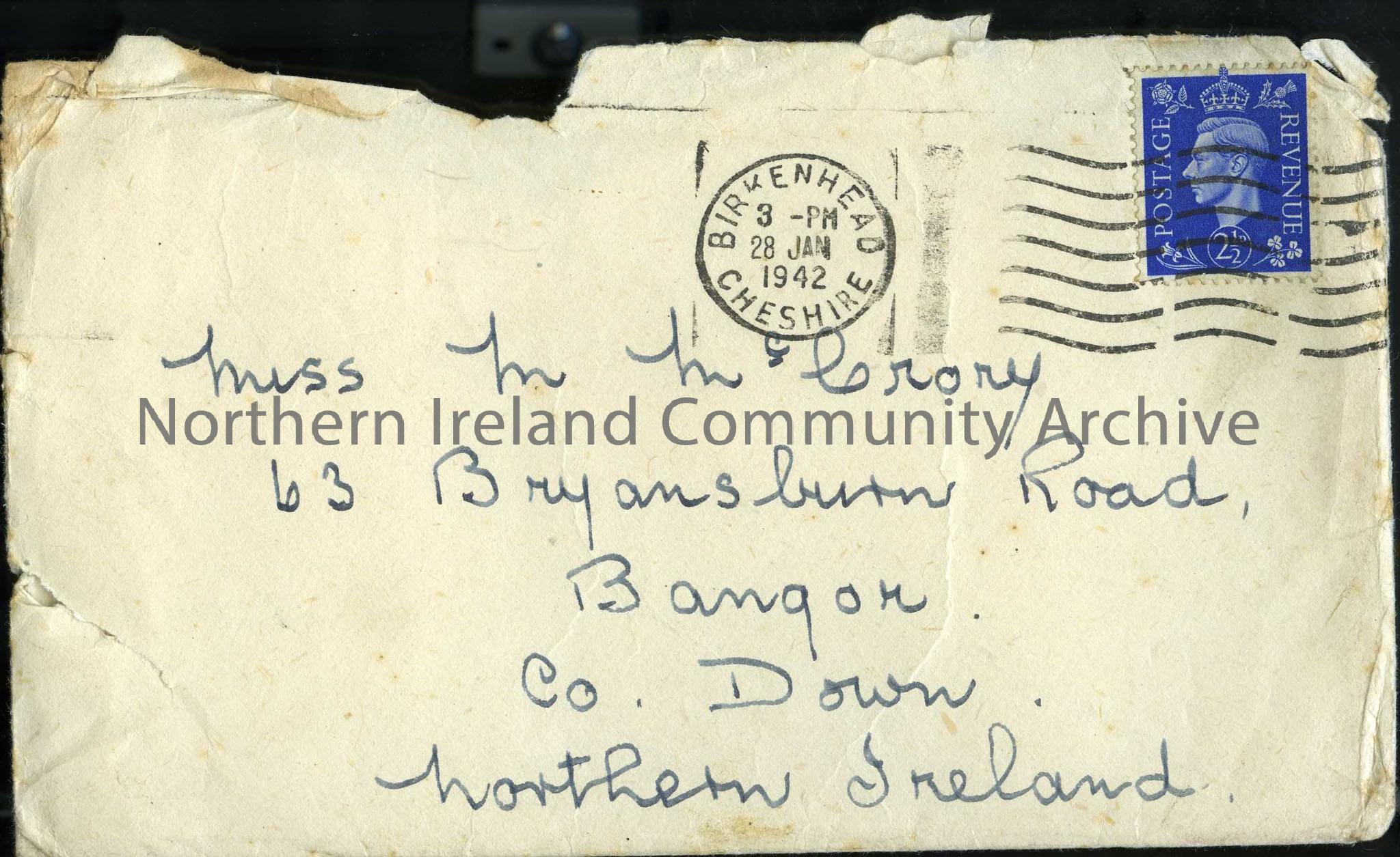 Addressed to Miss M McCrory, 63 Bryansburn Road, Bangor. Sent from Birkenhead, Cheshire 28th January 1942.