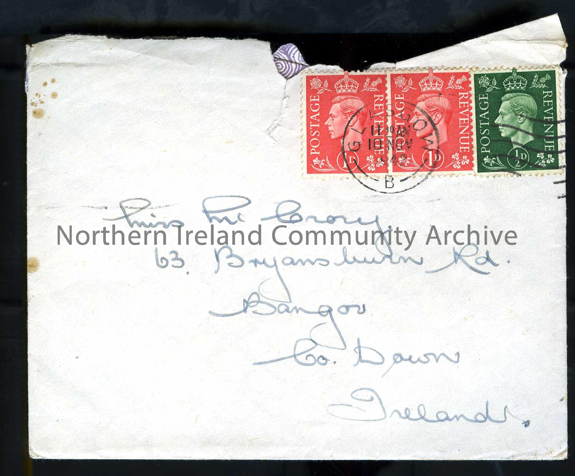 Addressed to Miss McCrory, 63 Bryansburn Road, Bangor. Co. Down. Ireland. Sent from Glasgow and dated 10th Nov 1942.