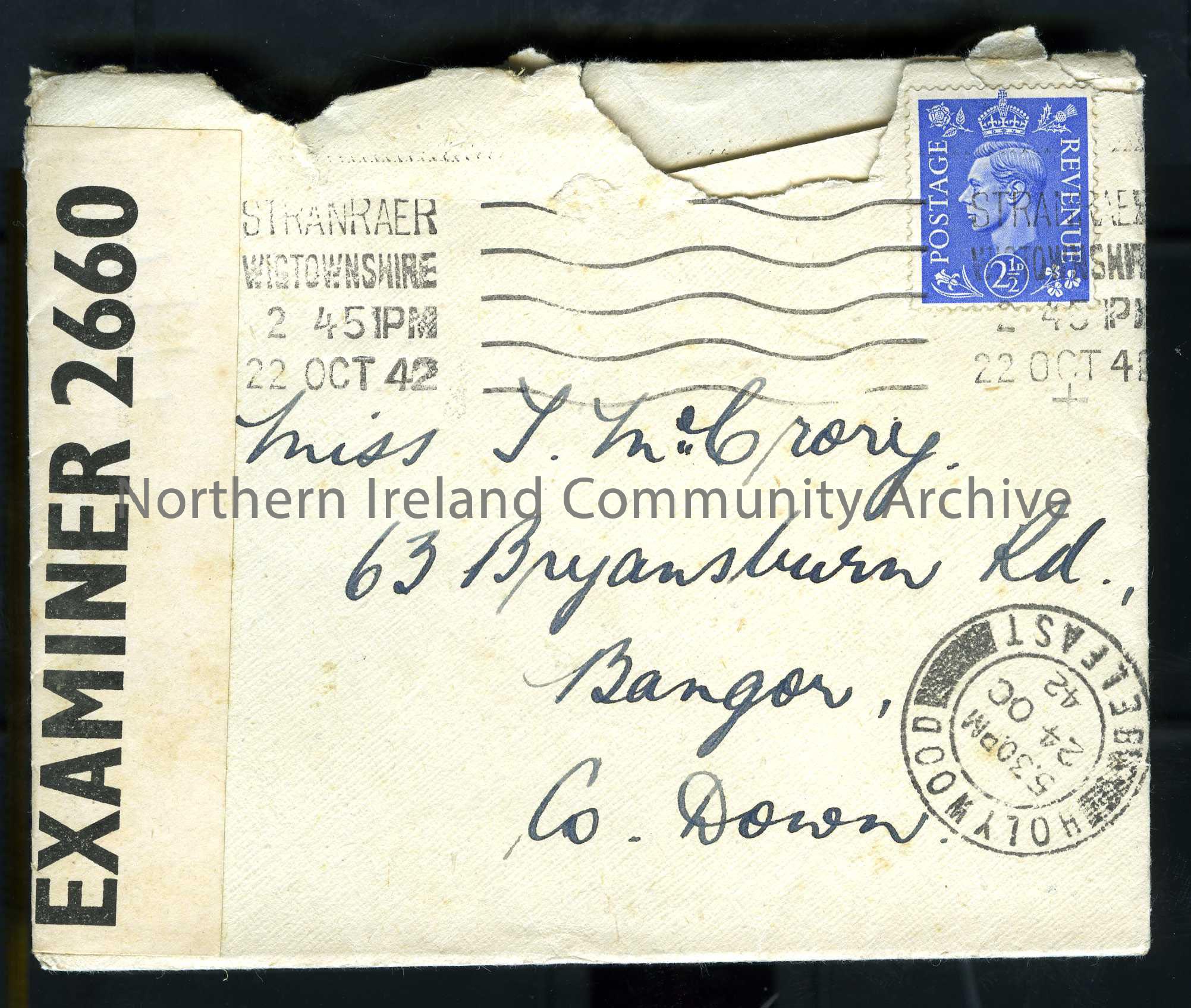 Addressed to Miss T McCrory, 63 Bryansburn Road, Bangor. Sent from Stranraer, Wigtownshire 22nd October 1942. Along the side is "opened by Examiner 2660"