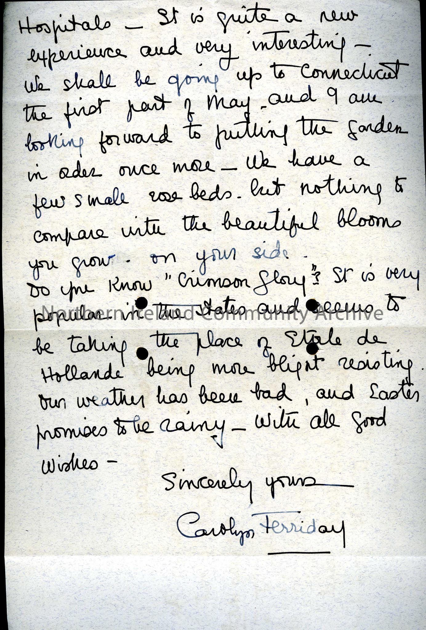 Addressed to Mr Henry from Carolyn Ferriday, New York City. Letter thanks Sam for sending an article on old Coleraine. Talks about training in practic… – Scan126
