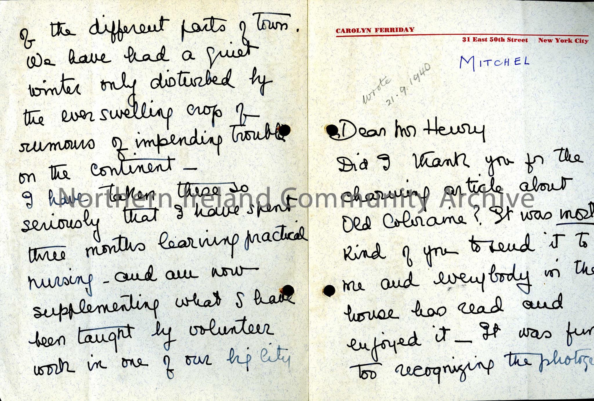 Addressed to Mr Henry from Carolyn Ferriday, New York City. Letter thanks Sam for sending an article on old Coleraine. Talks about training in practical nursing. In pencil is a note "wrote 21.9.1940".