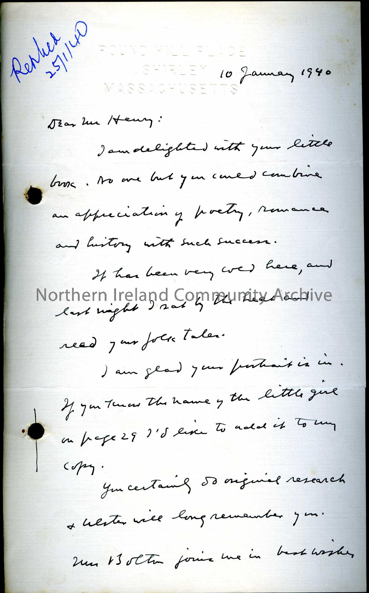 Addressed to Mr Henry from Charles K. Bolton, Pound Hill Place, Shirley, Massachusetts, dated 10th January 1940. Praising Sam's book of folk tales. "Ulster will long remember you."