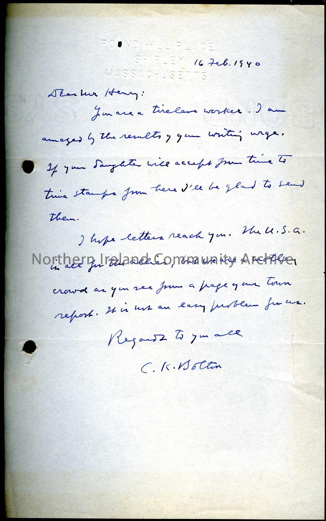 Addressed to Mr Henry from C.K. Bolton, Massachusetts, dated 16th February 1940. Writes that Sam is a 'tireless worker'. They will send Sam's daughter stamps from time to time. Comments on the war [World War II] - the USA as a 'motley crowd' compared to its Allies.