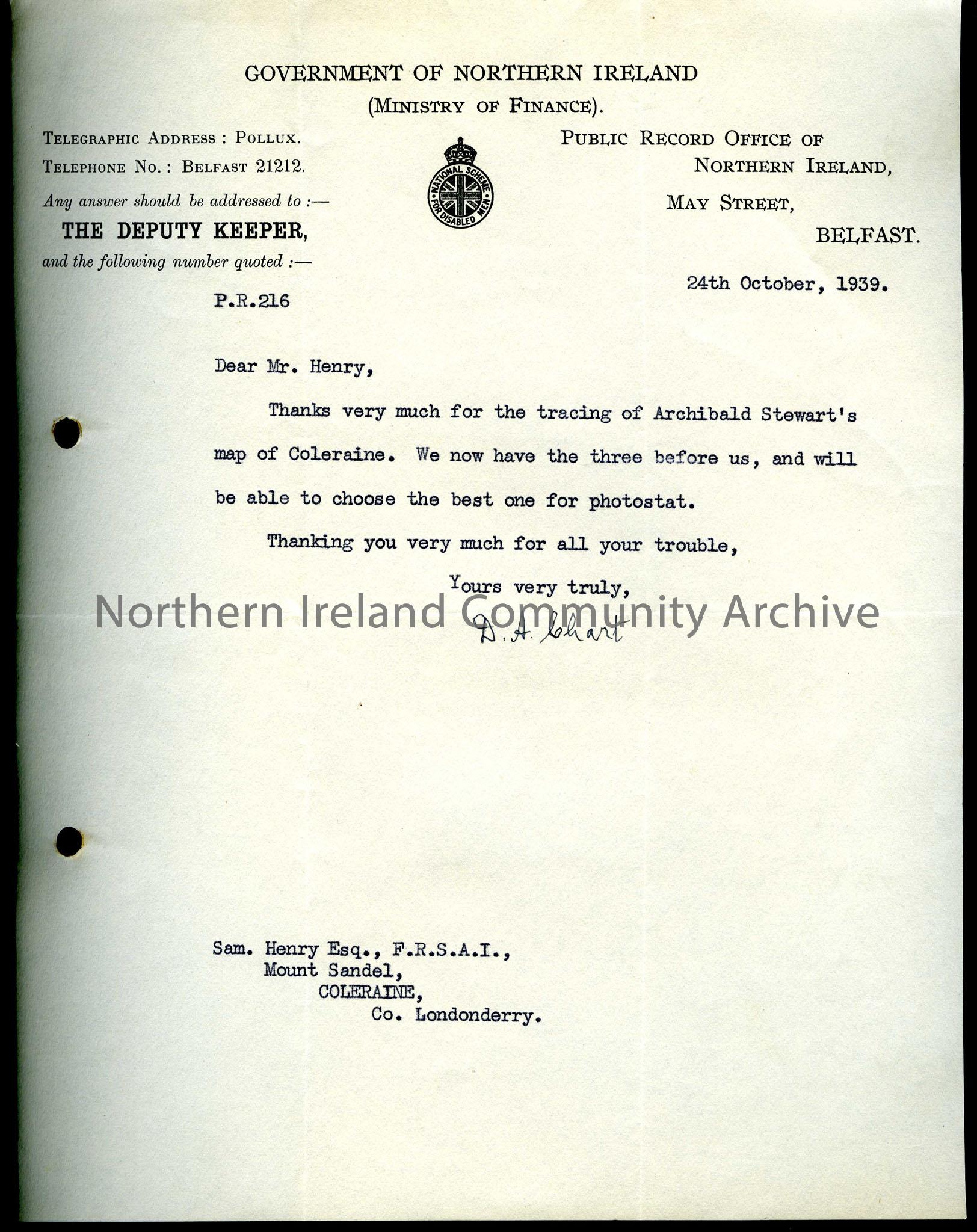 Addressed to Mr Henry from D. A. Chart, Public Record Office of Northern Ireland, dated 24th October 1939. Thanks Sam for tracing Archibald Stewart's map of Coleraine.