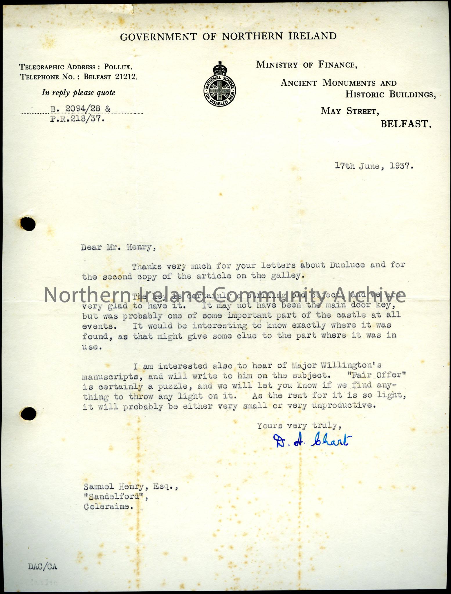 Addressed to Mr Henry from D.A. Chart, Ancient Monuments and Historic Buildings, Belfast, dated 17th June 1937. Re: Dunluce and an article on the galley. Sam has donated a key that he found at Dunluce Castle. Major Willington's manuscripts are mentioned.