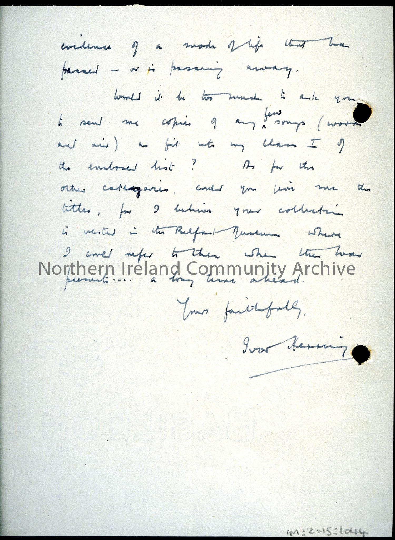 Addressed to Mr Henry from Ivor Herring(?), Essex, dated 8th November 1939. Re: asking Sam for songs from his collection relating to travel or anythin… – Scan189A