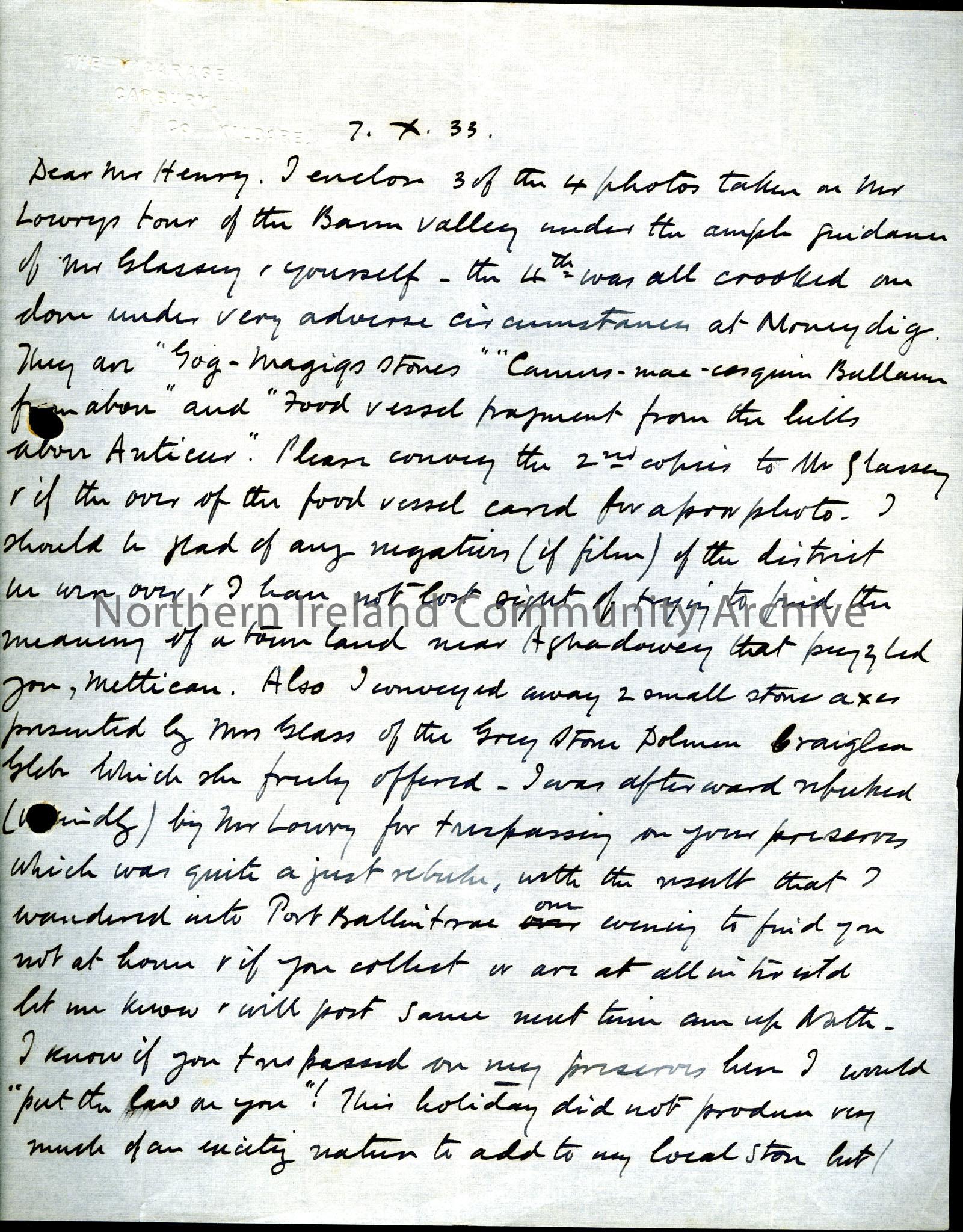Addressed to Mr Henry from Lindsay Massy Heuson, The Vicarage, Carbury, Co. Kildare, dated 7th October? 1933. Re: Mr Lowry's, Mr Glassey's and Sam's tour of the Bann Valley.