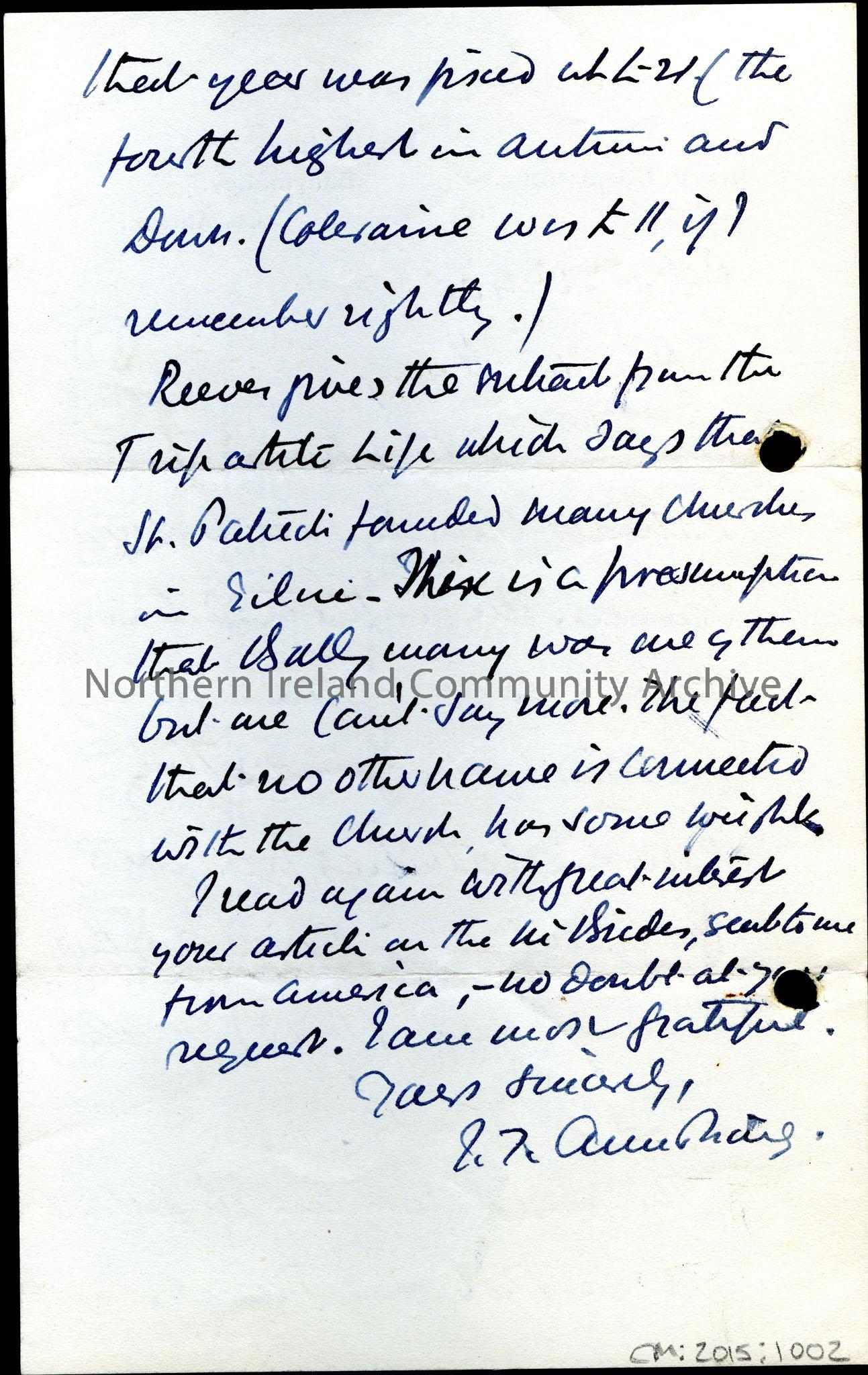 Addressed to Mr Henry from Rev. J.T. Armstrong, The Rectory, Ballymoney, dated 5th October 1940. Re: St Patrick’s Church. – Scan202b