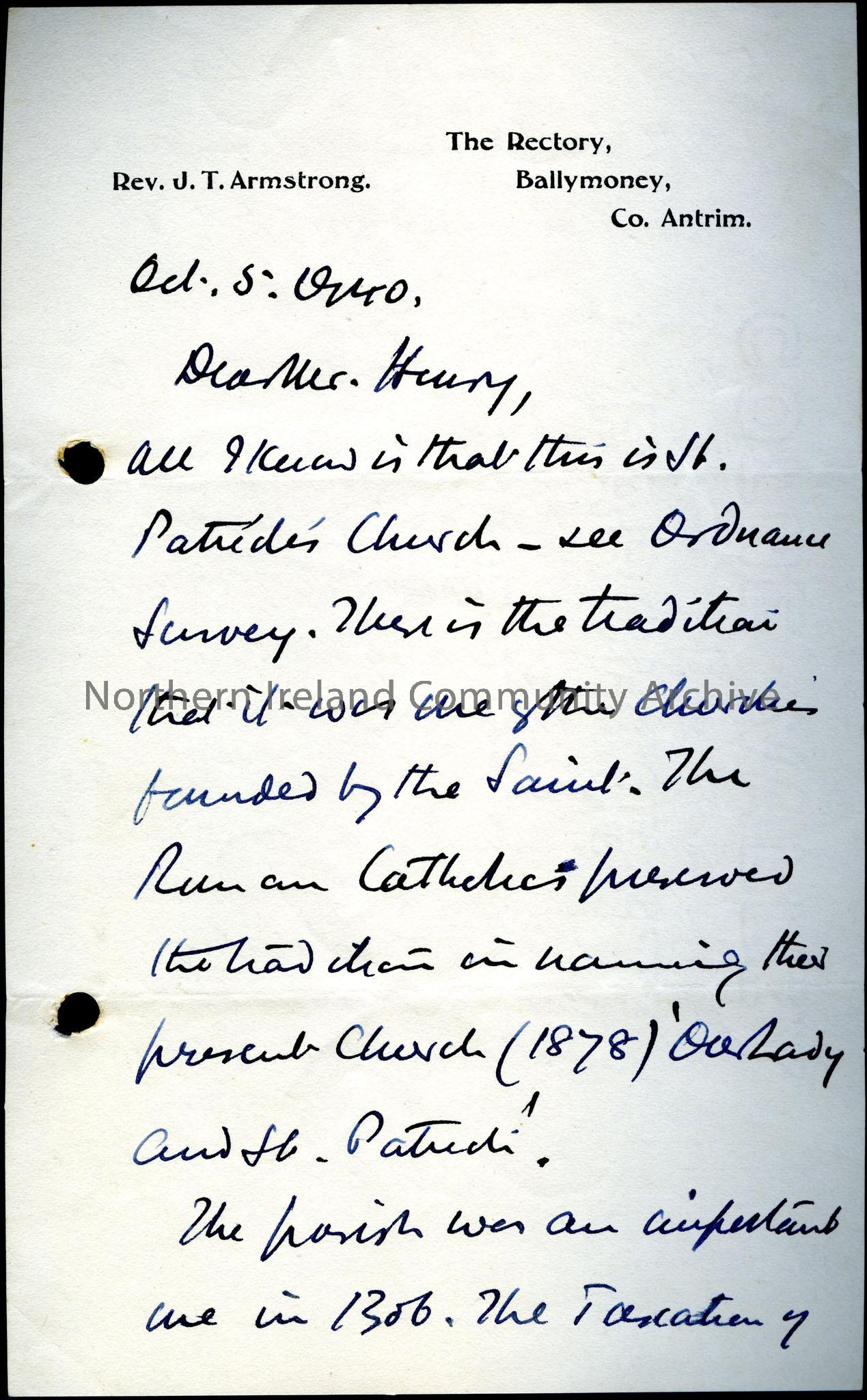 Addressed to Mr Henry from Rev. J.T. Armstrong, The Rectory, Ballymoney, dated 5th October 1940. Re: St Patrick’s Church.