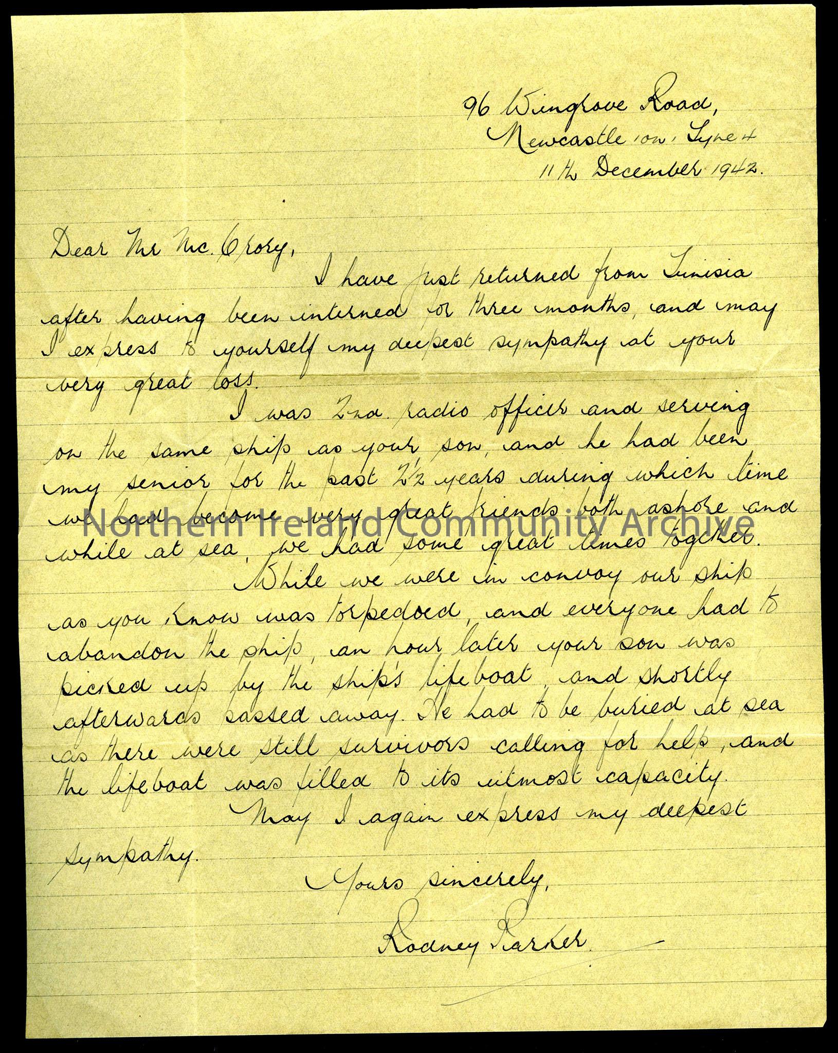 Addressed to Mr McCrory from Rodney Parker. Sent from 96 Wingrove Road, Newcastle 'on' Tyne and dated 11.12.1942. Writes that he has just returned from Tunisia after being interned for 3 months and that he would like to express his deepest sympathy for the loss of Bill. Explains that he was 2nd Radio Officer and a good friend of Bills. He then goes on to describe the ship being torpedoed and everyone having to abandon ship - Bill was picked up after an hour and passed away shortly after. He had to be buried at sea as the lifeboat he was in was full and there were still people calling for help.