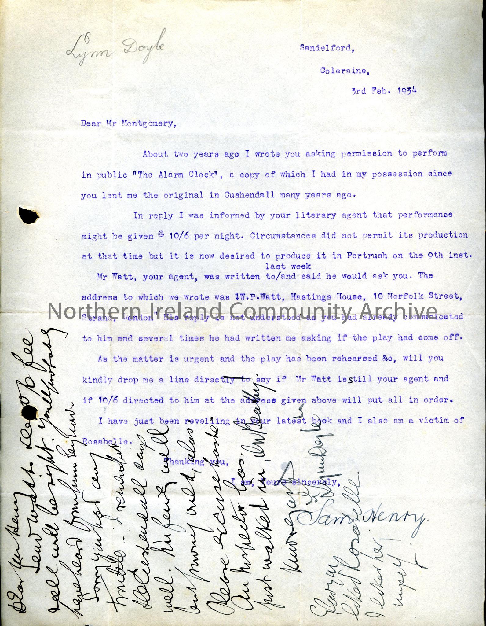 Addressed to Mr Montgomery from Sam Henry, dated 3rd February 1934. Re: permission to perform "The Alarm Clock" in Portrush. Reply handwritten at bottom of letter from Lynn Doyle.
