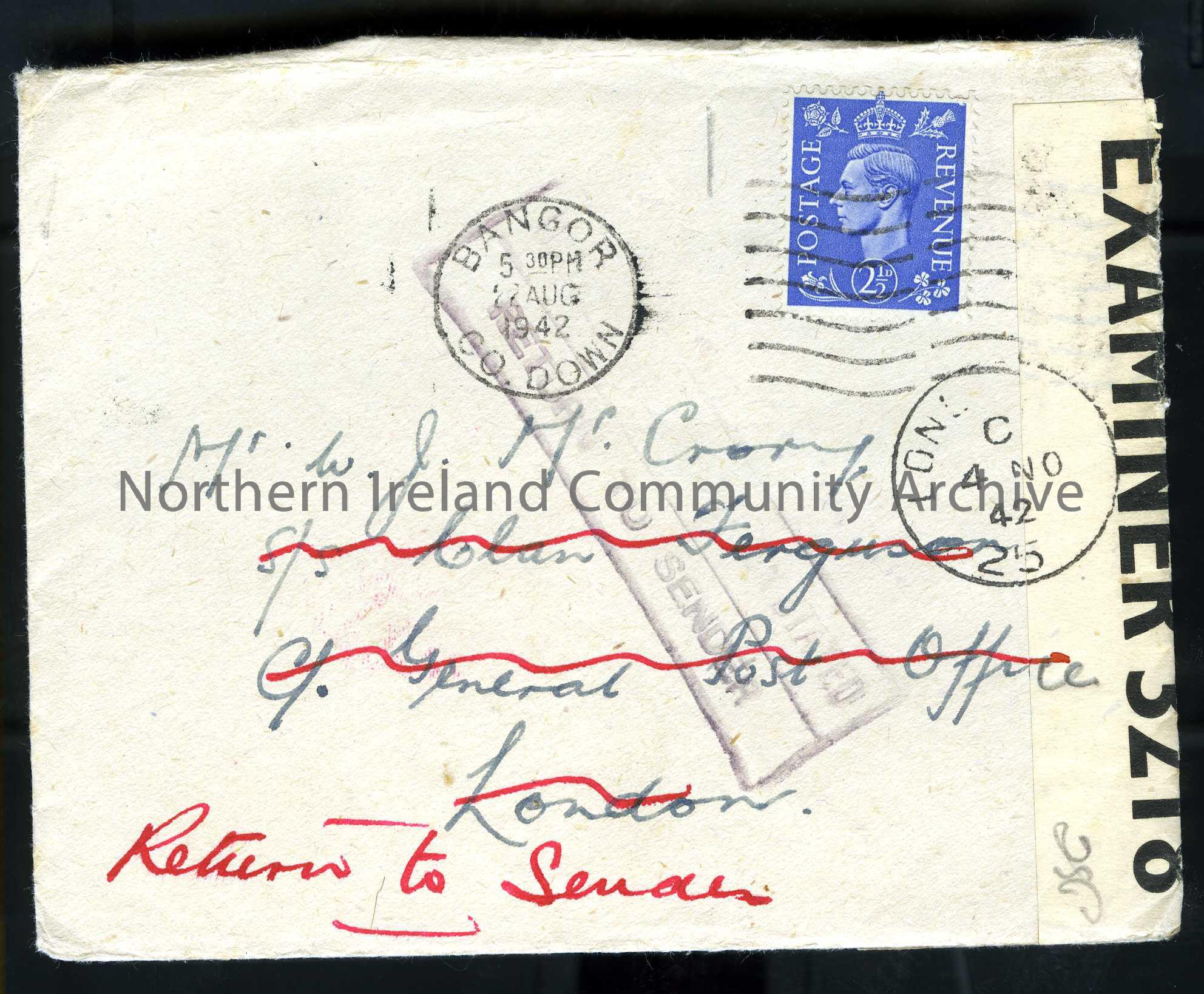 Addressed to Mr W J McCrory, s/s Clan Ferguson, General Post Office, London. Posted on 22nd August 1942. Address is crossed out in red and 'Return to Sender' is written underneath. Along the side is "opened by Examiner 3218"