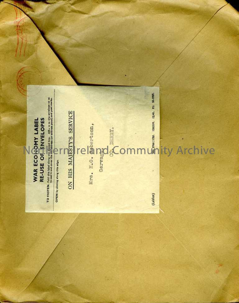 Addressed to Mrs H. G. Robertson, Garvagh, Co. Derry. Address is printed onto a ‘War Economy Label – Re-use of Envelopes’.