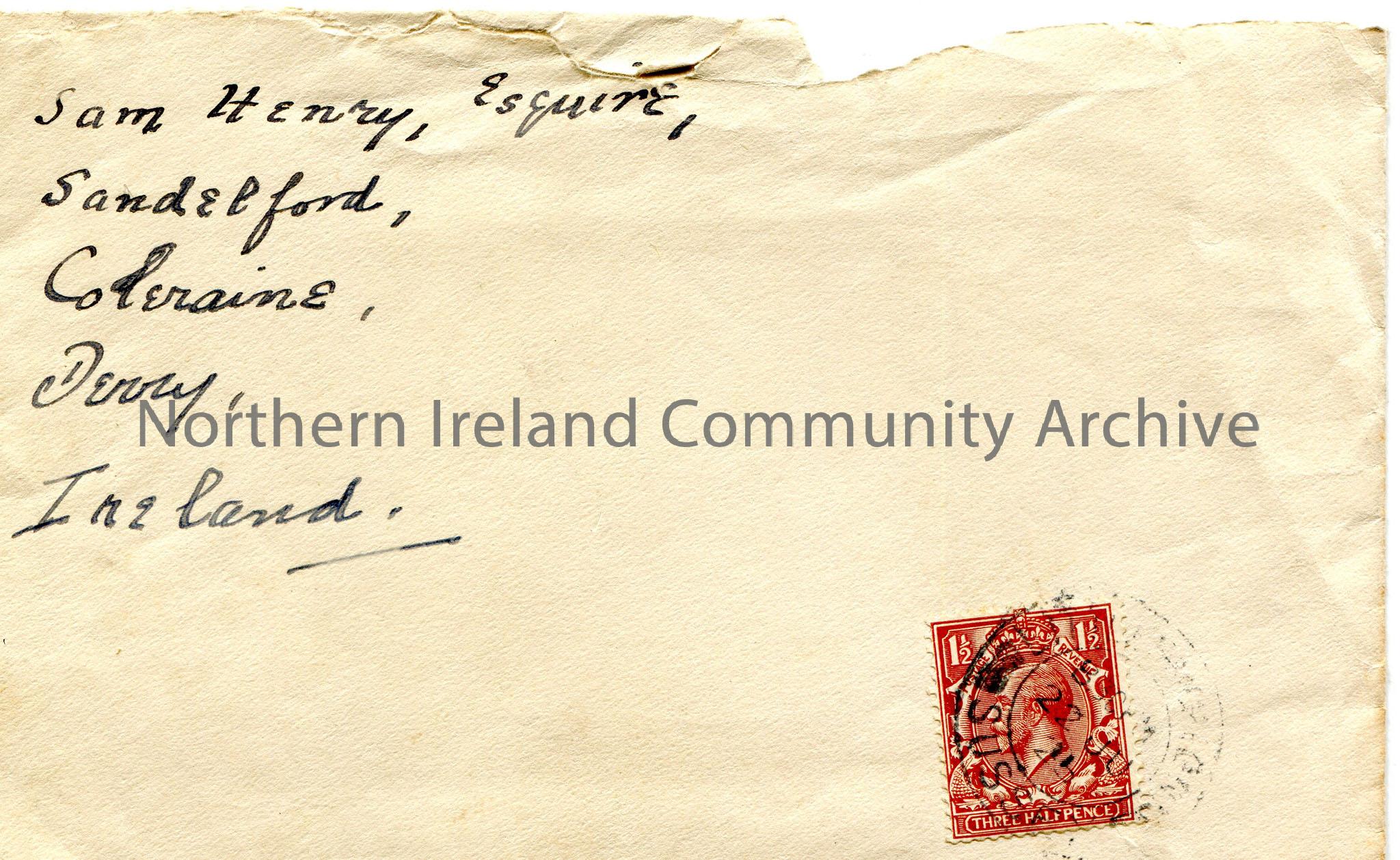 Addressed to Sam Henry, Esquire, Sandelford, Coleraine, Derry, Ireland. Stamped 22 June, 1940.