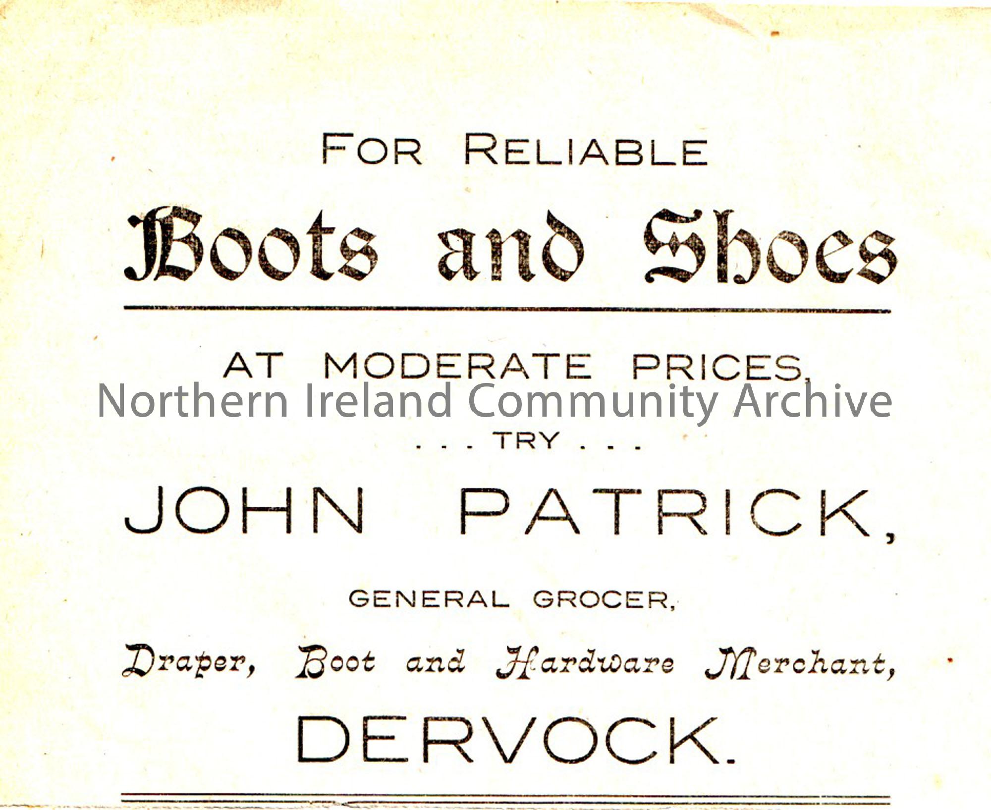 Advert for John Patton general grocers Dervock.