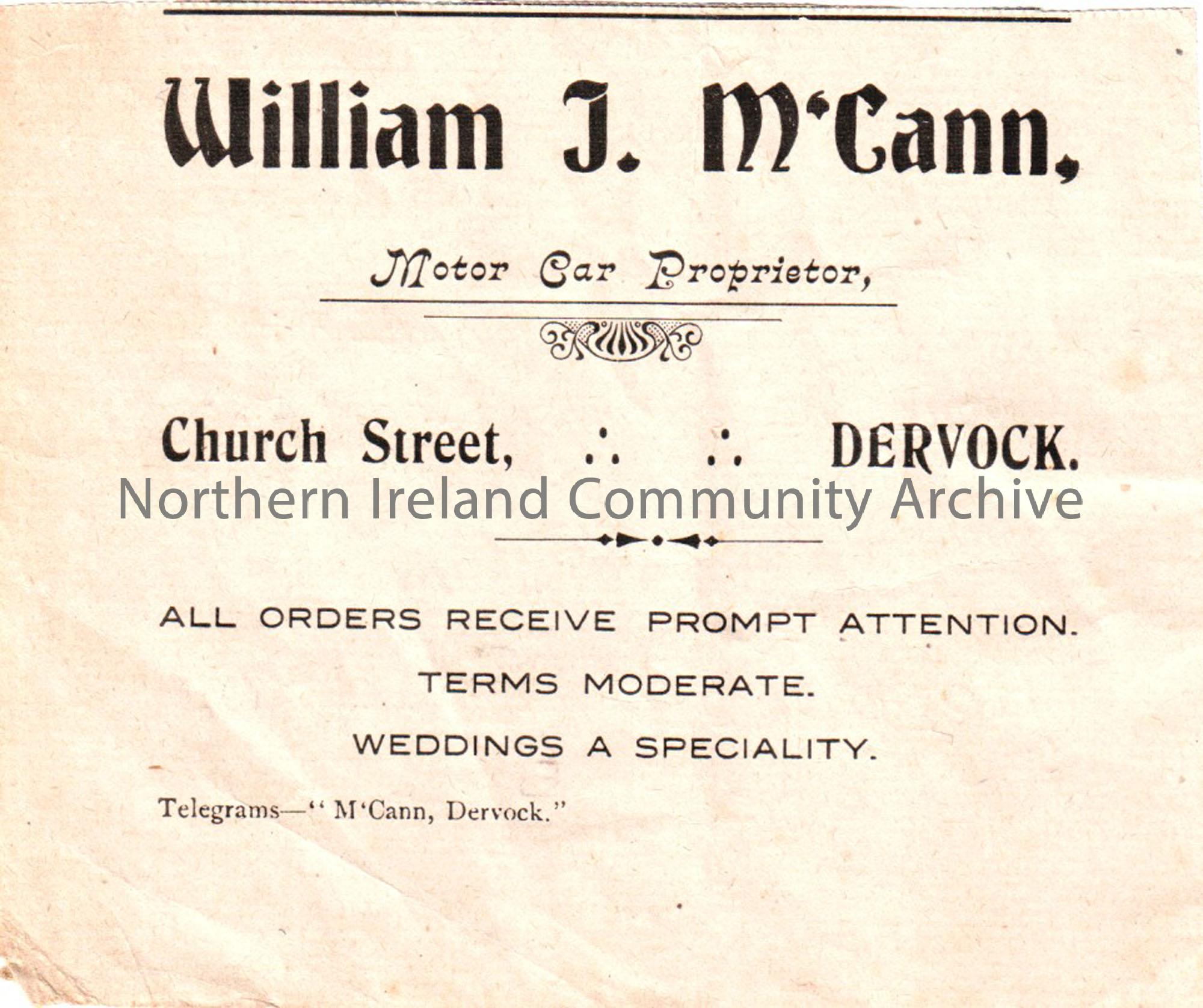 Advert for William J. McCann, motor car proprietor, Church Street, Dervock.