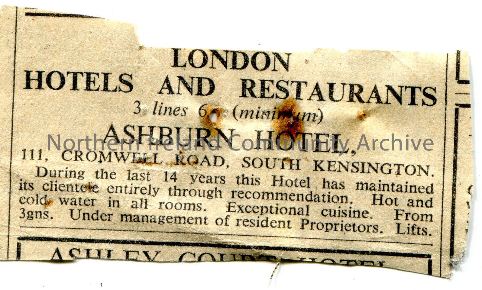 Advertisement cut out of newspaper for accommodation in London, Ashburn Hotel, 111 Cromwell Road, South Kensington.
