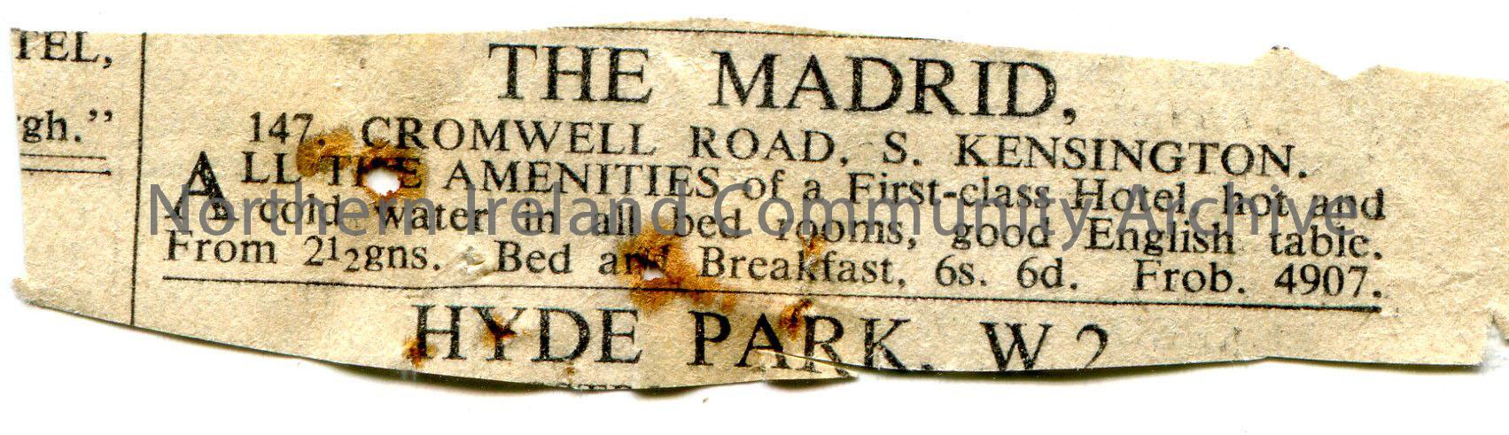 Advertisement cut out of newspaper for hotel accommodation in London, The Madrid, 147 Cromwell Road, South Kensington.