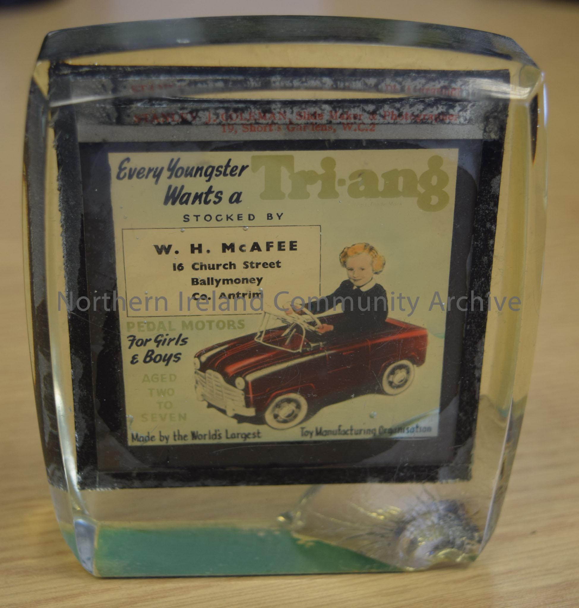 Advertisement for W. H McAfee. Transparent block with painted image of girl driving red pedal car in a black frame suspended inside.
