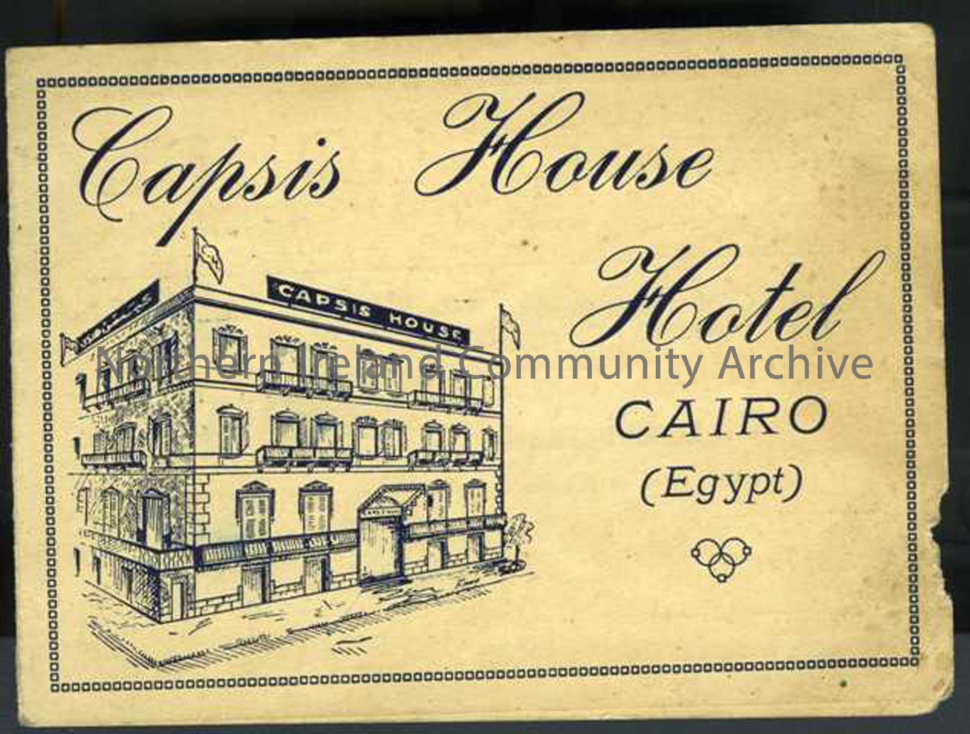 Advertising card for Capsis House, Cairo. Drawing of hotel on front. Map on back.