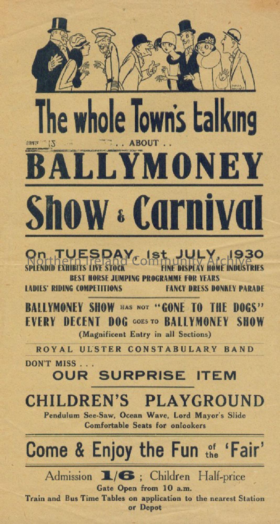 Advertising poster for the Ballymoney Show. Inscribed, ‘The whole town’s talking about Ballymoney Show and Carnival on Tuesday 1st July, 1930’. Depict…
