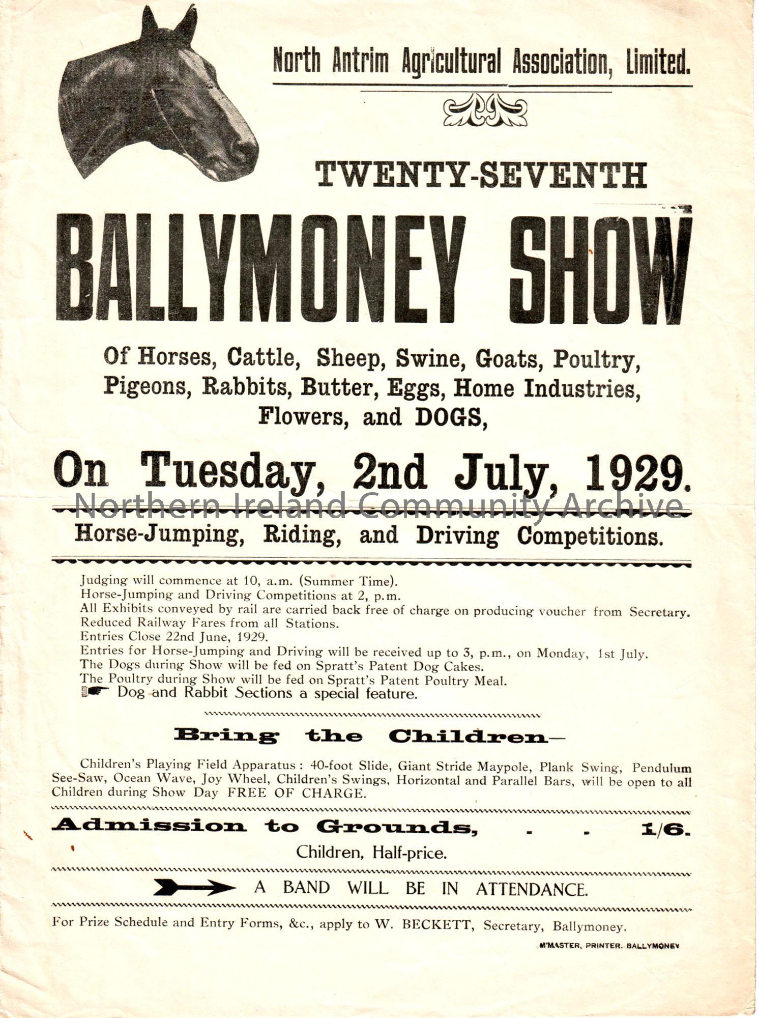 Advertising poster for the Ballymoney Show. Inscribed, ‘The whole town’s talking about Ballymoney Show and Carnival on Tuesday 2nd July, 1929’. Depict…
