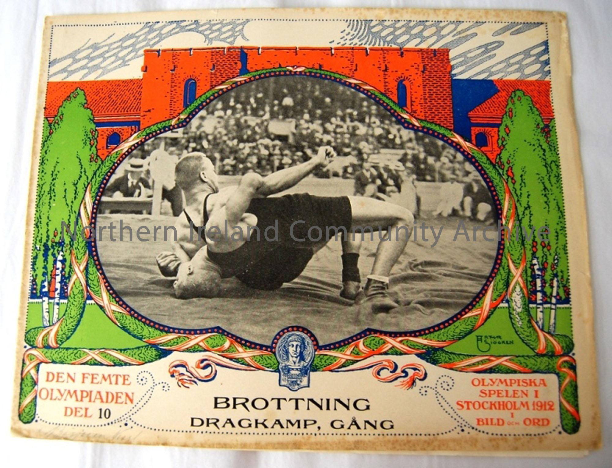 After the 1912 Olympic games 24 booklets were produced in Swedish. This issue features the wresting tug of war