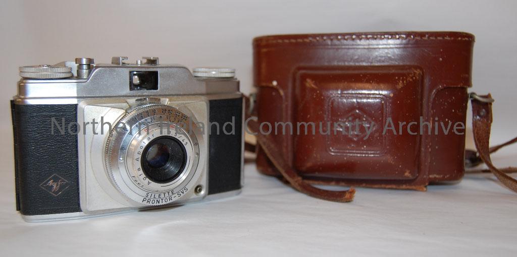 Agfa 35mm camera. Metal and plastic camera body with brown leather cover. Made in Germany. – 2010.381 (6)