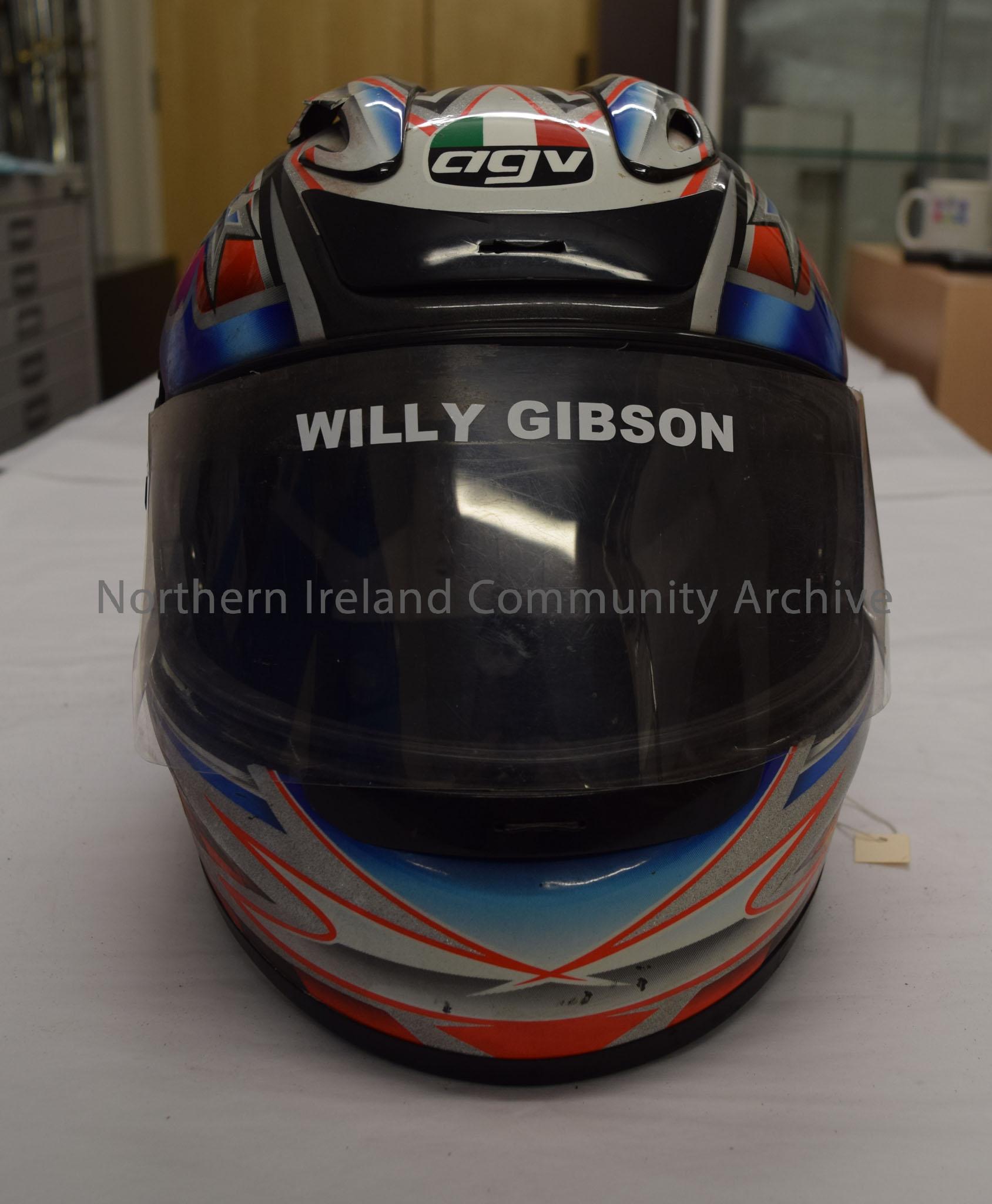 AGV helmet belonging to Willie Gibson. Black with white orange and blue pattern with black and orange check running down the middle