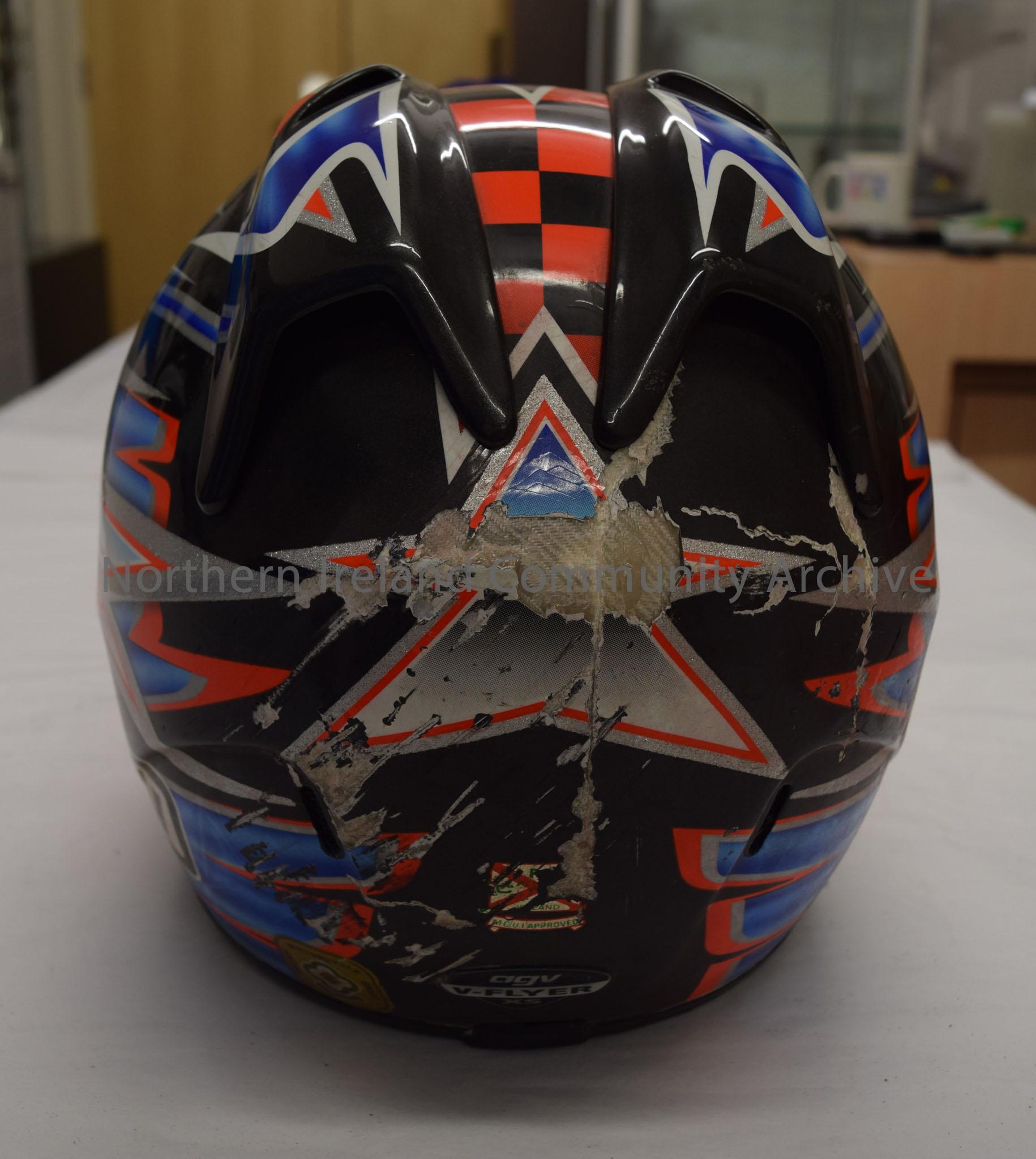 AGV helmet belonging to Willie Gibson. Black with white orange and blue pattern with black and orange check running down the middle