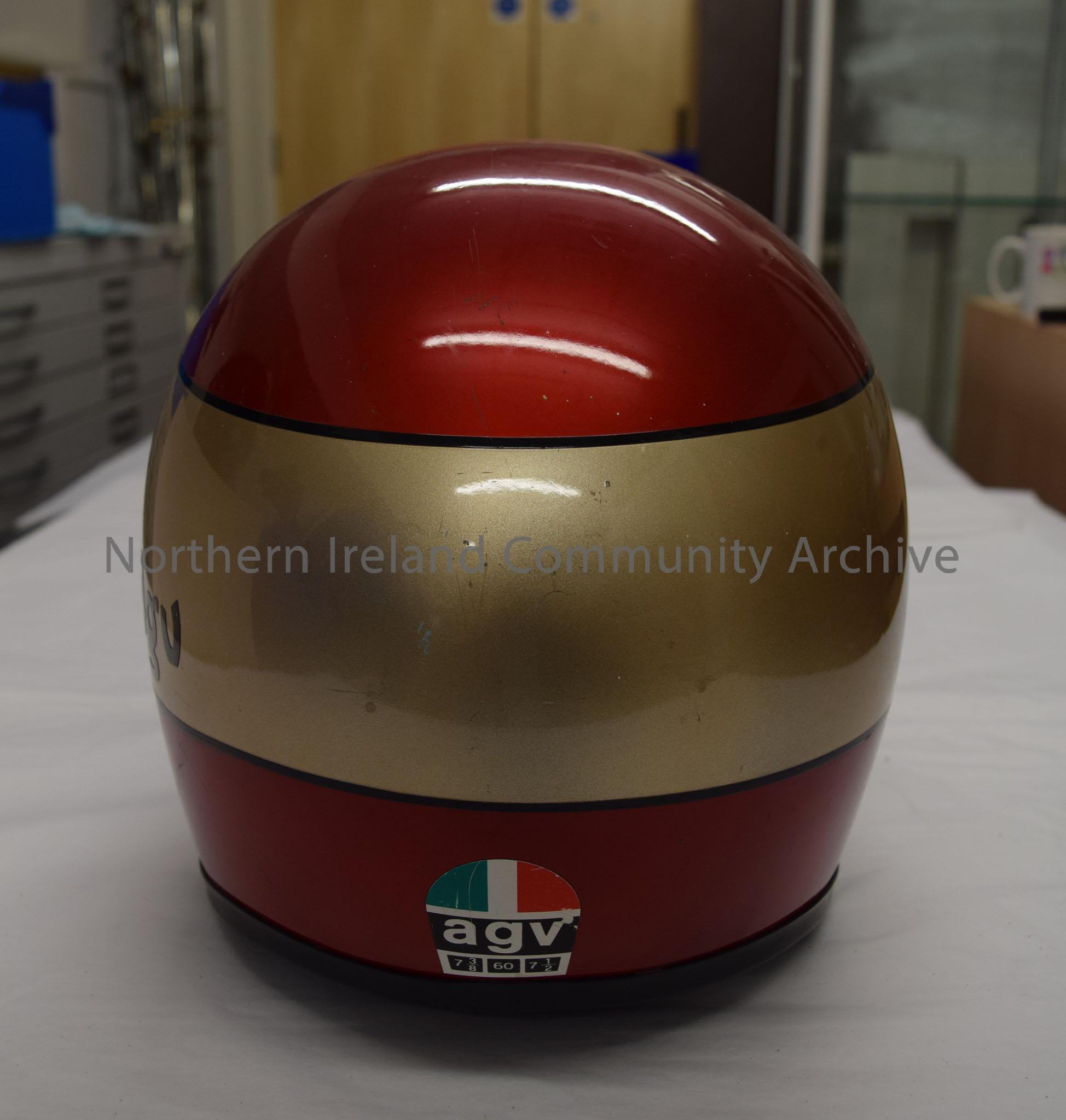 AGV motorcycle helmet belonging to Des Barry. Dark red helmet with gold band around the middle with black trim and tinted visor.