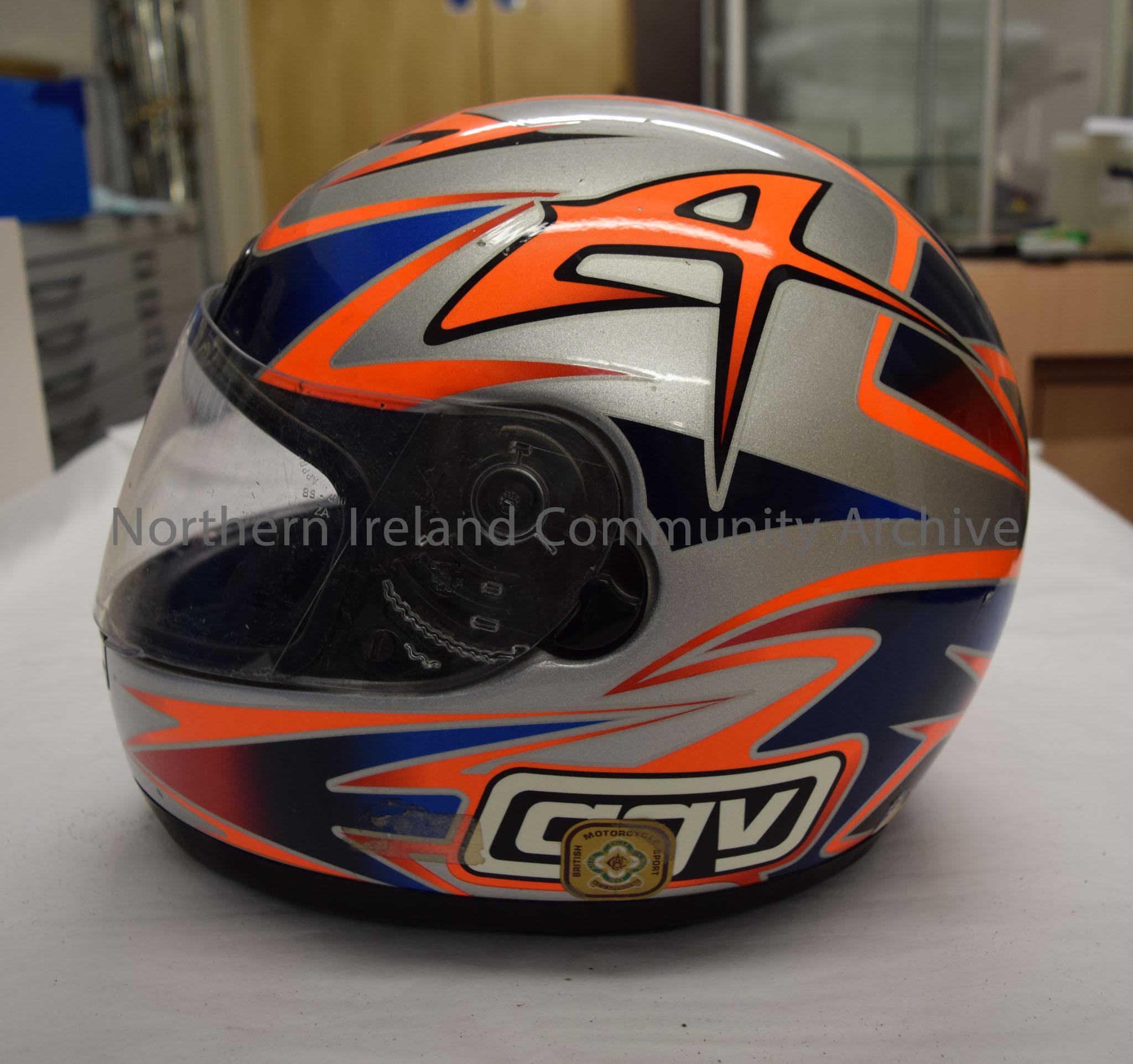 AGV motorcycle helmet belonging to Kenny McRae. Dark blue with a bright orange and silver pattern. Bright orange “A” with a black border on both sides… – 2016.65 (3)