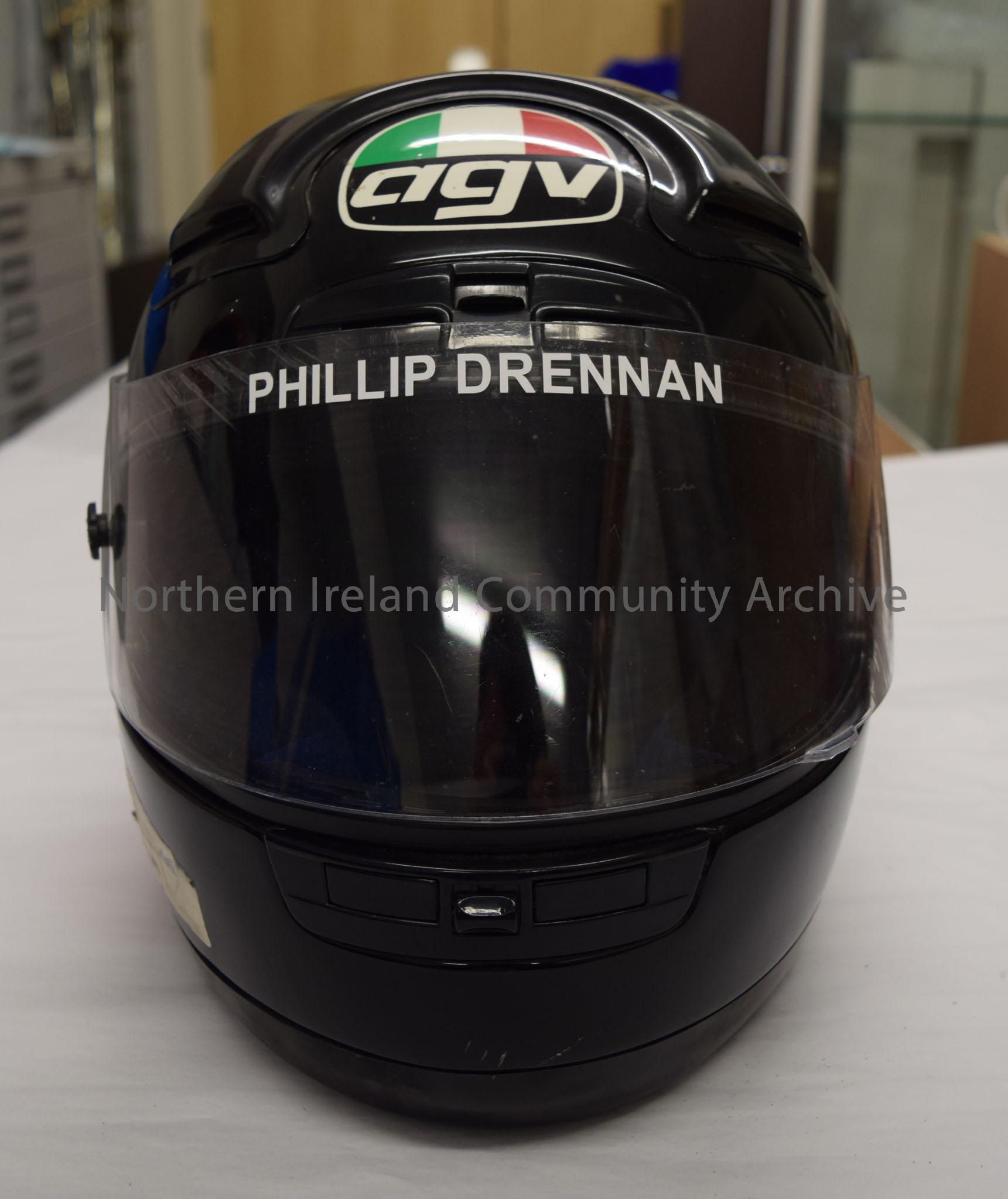 AGV motorcycle helmet belonging to Philip Drennan. Plain black