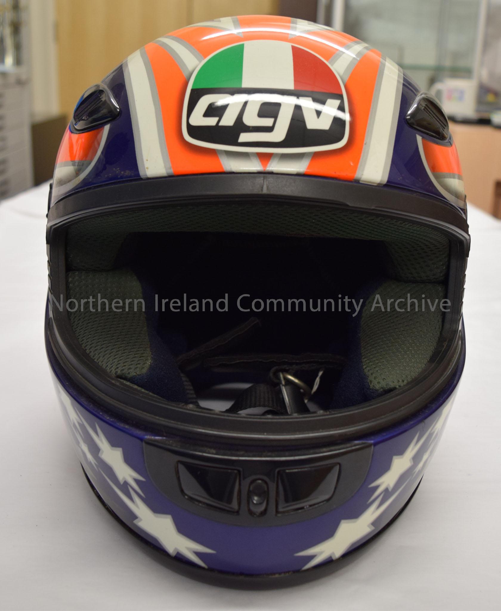 AGV motorcycle helmet. Navy blue with bright orange and white pattern with silver trim and white stars on the chin bar. – 2016.20 (2)