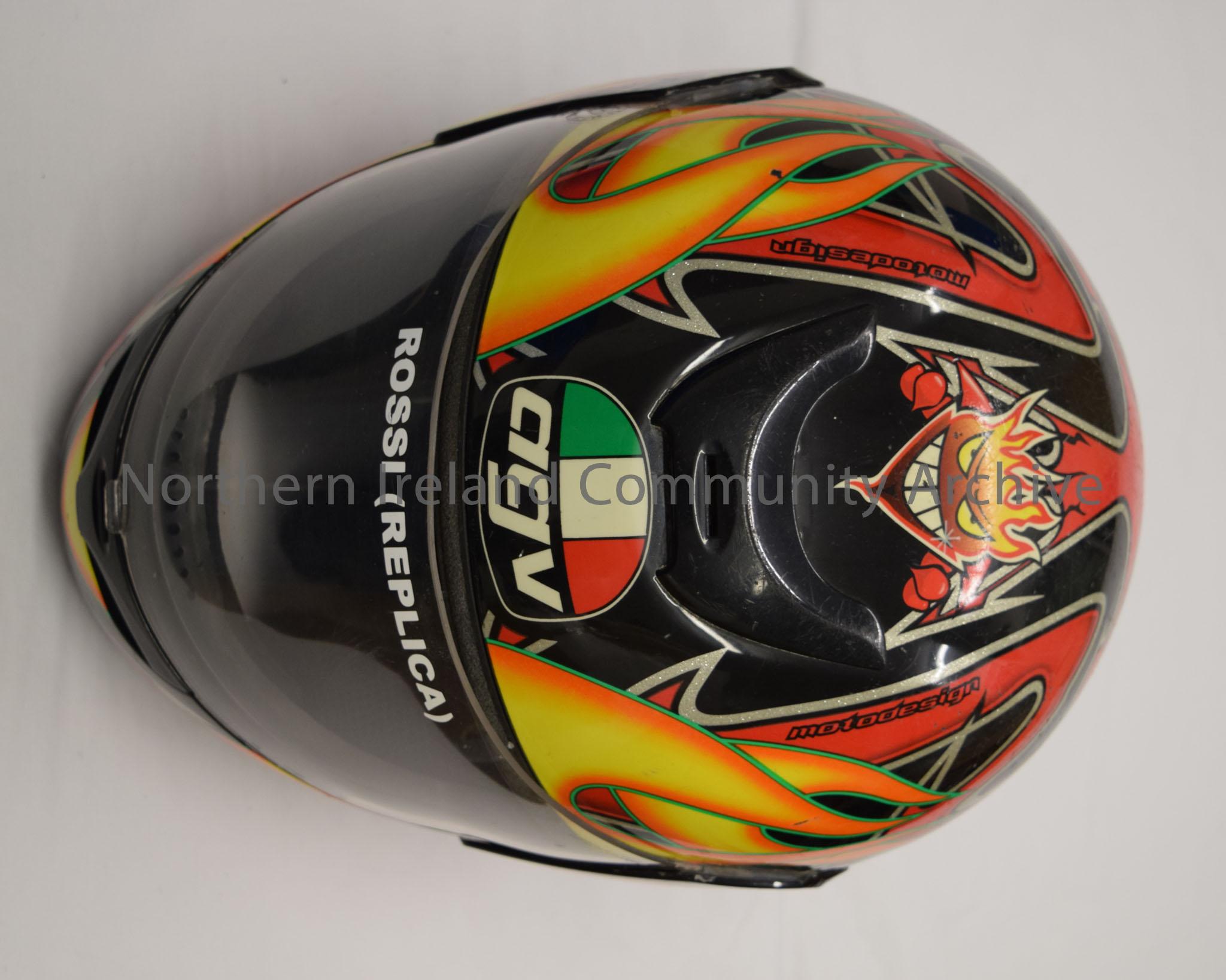 AGV Valentino Rossi replica motorcycle helmet. Black with orange flames with green trim and red devil’s tails with sparkling silver trim. Images of a …